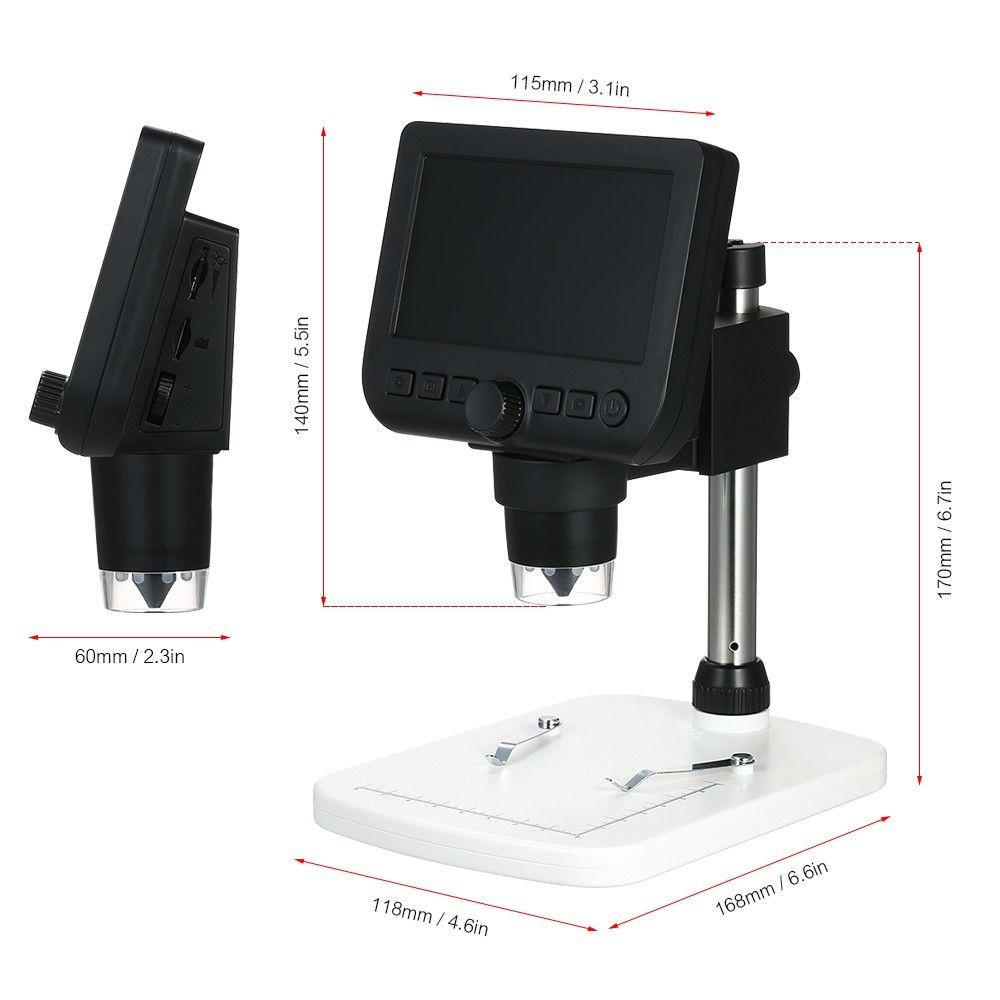 4.3inch LCD standalone inspection microscope with 800X magnification, high brightness 8 LEDs and 3.0MP will provide a good way for you to share high definition microscopic observation with others. Come with a holder to help support the microscope. Equipped with professional microscopic lens, it helps you to see tiny objects easily and open the doors of the micro-world for you. Suitable for industrial inspection, electronic accessories inspection, textile inspection, jewelry inspection, printing inspection, etc.