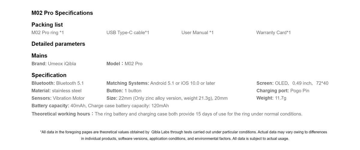 Packing listM02 Pro ring *1 USB Type-C cable*1User Manual *1Warranty Card*1