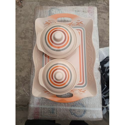 This unbreakable tableware is made from the finest quality and it features 2 round bowl or deep plates with cover & protracted handles and a tray for convenience. it is highly durable and efficient as it is unbreakable. It can be used in homes, restaurants, hotels, offices and can also be used to serve meals to adult and children. It is very stylish, unbreakable, easy to clean and aesthetic.It is very beneficial when serving two course meals like Rice & Stew, Amara and Ewedu, Fufu and Soup of your choice. It is mostly designated for serving important guests at home, events and Eateries.