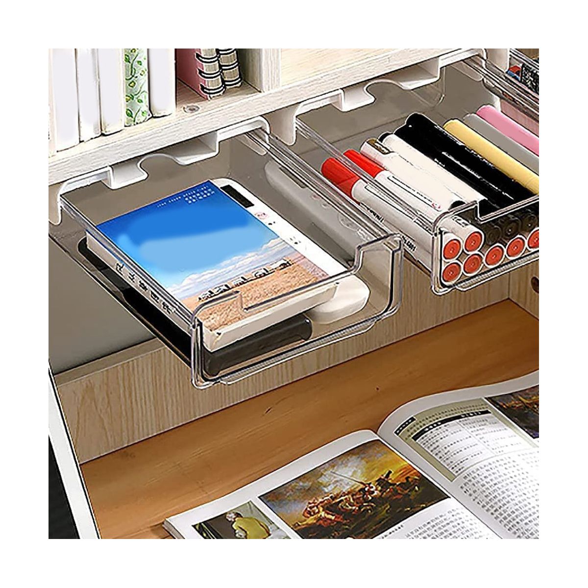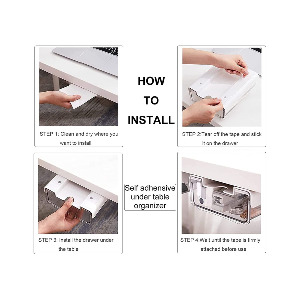 Easy to install - under desk drawers are easy to install on a surface with two strips of tape. It perfectly protects your desk or closet from damage. It has two strips of adhesive tape. Press the adhesive tape a little to that the adhesive tape is firmly adhered to the surface. It is better to use it after 24 hours for better bonding effect