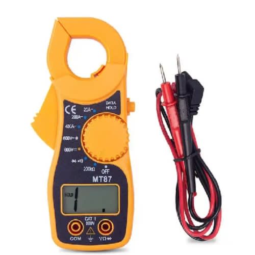 Portable multimeter digital clamp meter small clamp flow meter MT87 buzzer anti-burn zero fire wire data retentionMT-87 Digital Clamp Meter Electronic Tester Pocket Clamping Meter for Measuring AC/DC Voltage, AC Current, Resistance, Data Hold & Overload Protection in Portable Mini MT87 Electric Testing Specification: AC Current: Range 10mA ~ 20A, 100mA ~ 200A, 1A ~ 400A. Overload protection: 400A on all ranges. AC Voltage: Range 1V ~ 450V. Overload protection: 450V AC on all ranges. DC Voltage: Range 1V ~ 600V. Overload protection: 600V DC / (peak AC) on all ranges. Diode Test, Continuty test, Resistance measurements,Transistor P-N junction test. Continuity test with buzzer sound while & lt; 75 Ohm. Resistance Measurement: 200K Ohm Range. Max display: 1999, Auto polarity display. Data hold function. Power : 2 x AAA 1.5V battery (Included for you) Cable length : about 80 cm. Weight : 203g. Dimension: 150 x 65 x 28 mm. Note : If a battery signal appears on the display, it indicates battery should be replaced. Package Includes : 1 x MT87 Digital Clamp Multi-meter. 2 x AAA Batteries. 1 x Testing Leads Pair