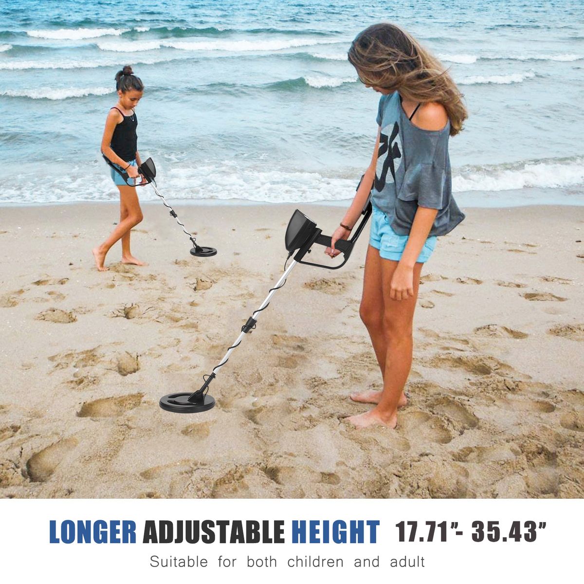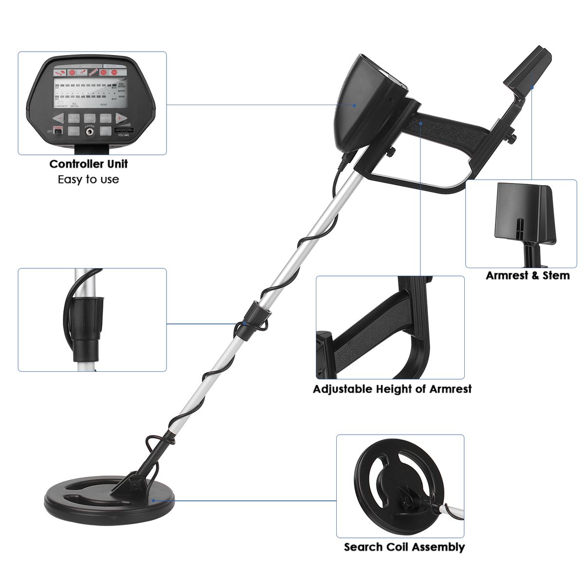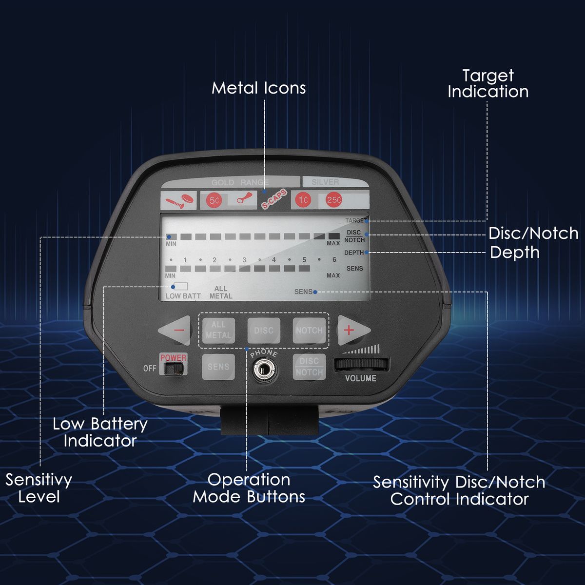 features - LCD display, 3 tone audio feedback, ALL METAL/DISC/NOTCH mode, automatic ground balance, super slow sweep identification, 3.5mm headphone jack, waterproof coil, adjustable height, volume control and more.