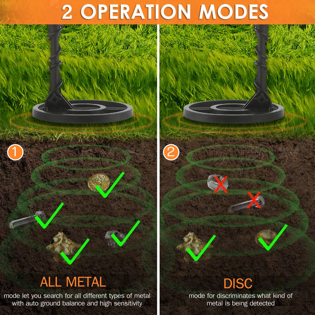2 Operation Modes: ALL METAL mode let you search for all different types of metal with auto ground balance and high sensitivity. DISC for discriminates what kind of metal is being detected.