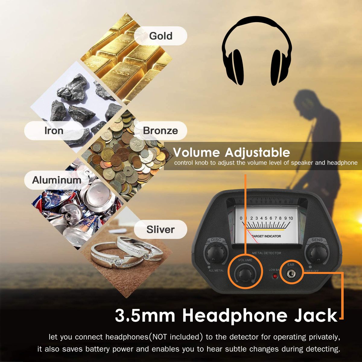 3.5mm Earphone Jack: you can connect headphones (not supplied) to the detector so you can listen privately. Using earphones also saves battery power and makes it easier to identify subtle changes in the sounds you hear, for better detection results.
