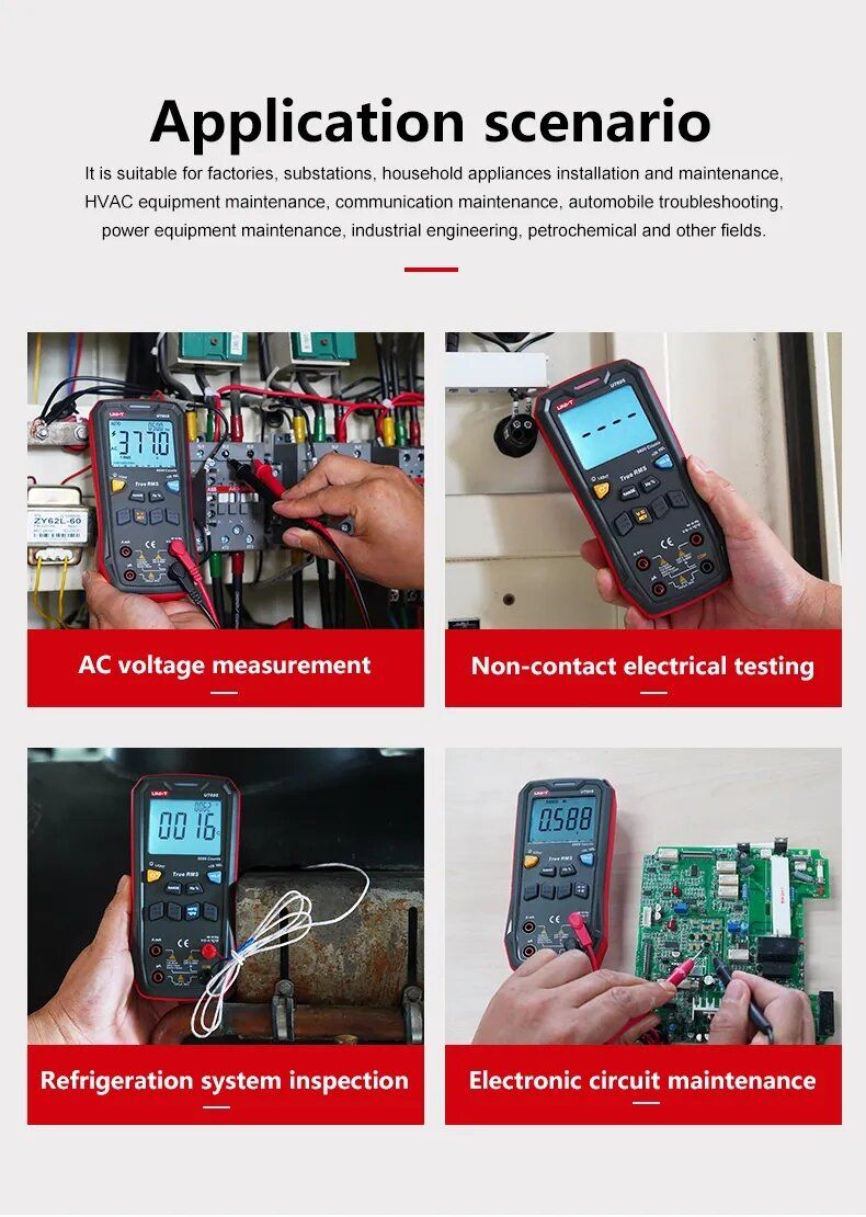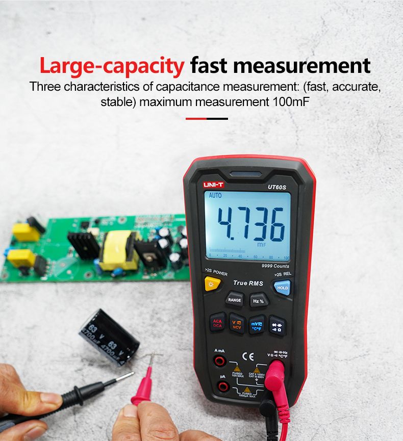 UT60 series digital multimeters provide True-RMS measurement, 9999-count resolution, non-contact voltage detection and many convenient features for users'; testing needs. These auto-ranged meters can measure up to 1000V AC/DC voltage, 10A AC/DC current and 100M Omega; resistance. The easy-to-use interface with backlight enables you to detect equipment quickly even in dark places.