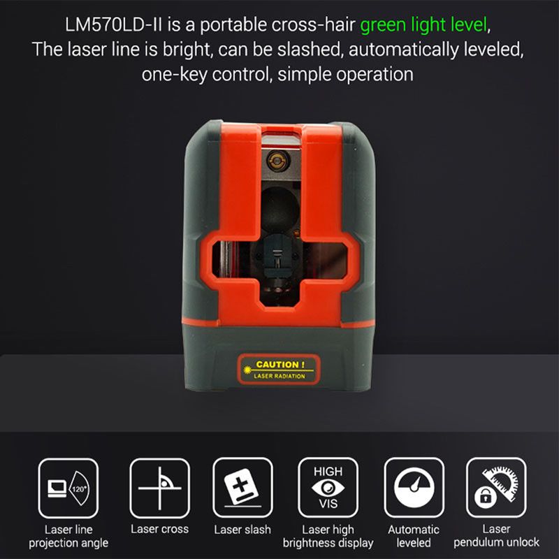 ● Self-leveling mode & manual mode ● Outdoor pulse mode ● 5200mAh Li-ion battery ● Type-C DC-in port ● Complimentary bracket These laser levelers are equipped with green LD laser, suitable for large or bright work places. Its applications include: horizontal, vertical, cro line projection for decoration, building construction, home decoration, renovation, furniture installation, flooring, and project layout. LM570LD-II CertificatesCE, RoHS Laser typeGreen LD Laser lines2 lines Operating distance10m Laser accuracy±3mm/10m Self-leveling range3°±1° Self-leveling time3s Working hours4h Laser wavelength520nm Laser cla2 GENERAL CHARACTERISTICS Power1.5V battery x 2 (LR6) Product net weight240g Product size85.5mm x 62mm x 90.3mm Standard acceoriesUSB cable, adapter, English manual Standard individual packingGift box, tool box Standard quantity per carton20pcs Standard carton measurement420mm x 320mm x 350mm Standard carton gro weight10.71kg