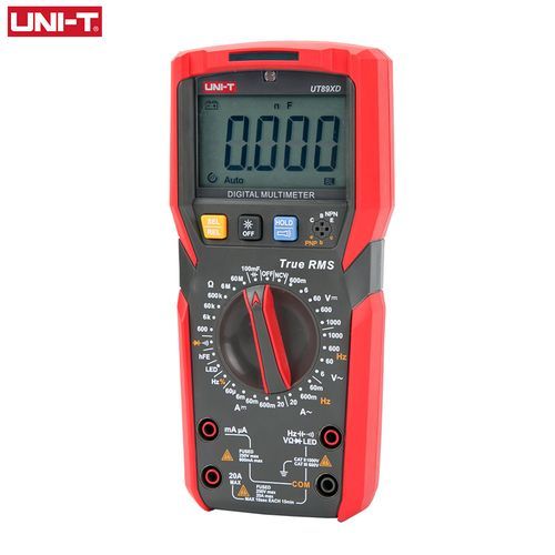 UT89X/UT89XD is a reliable hand-held 35/6 bit digital multimeter with true RMS sine wave measurement. It can measure Max. 1000V DC/AC voltage, Max. 20A DC/AC current, resistance, capacitance, frequency, diode, hFE, continuity and NCV, quickly distinguishing between neutral and live wires accurately. UT89X can measure temperature and detect neutral and live wires with a test lead. UT89XD can perform LED test. It attracts users with its bi-color durable case, modern exterior and multiple functions.