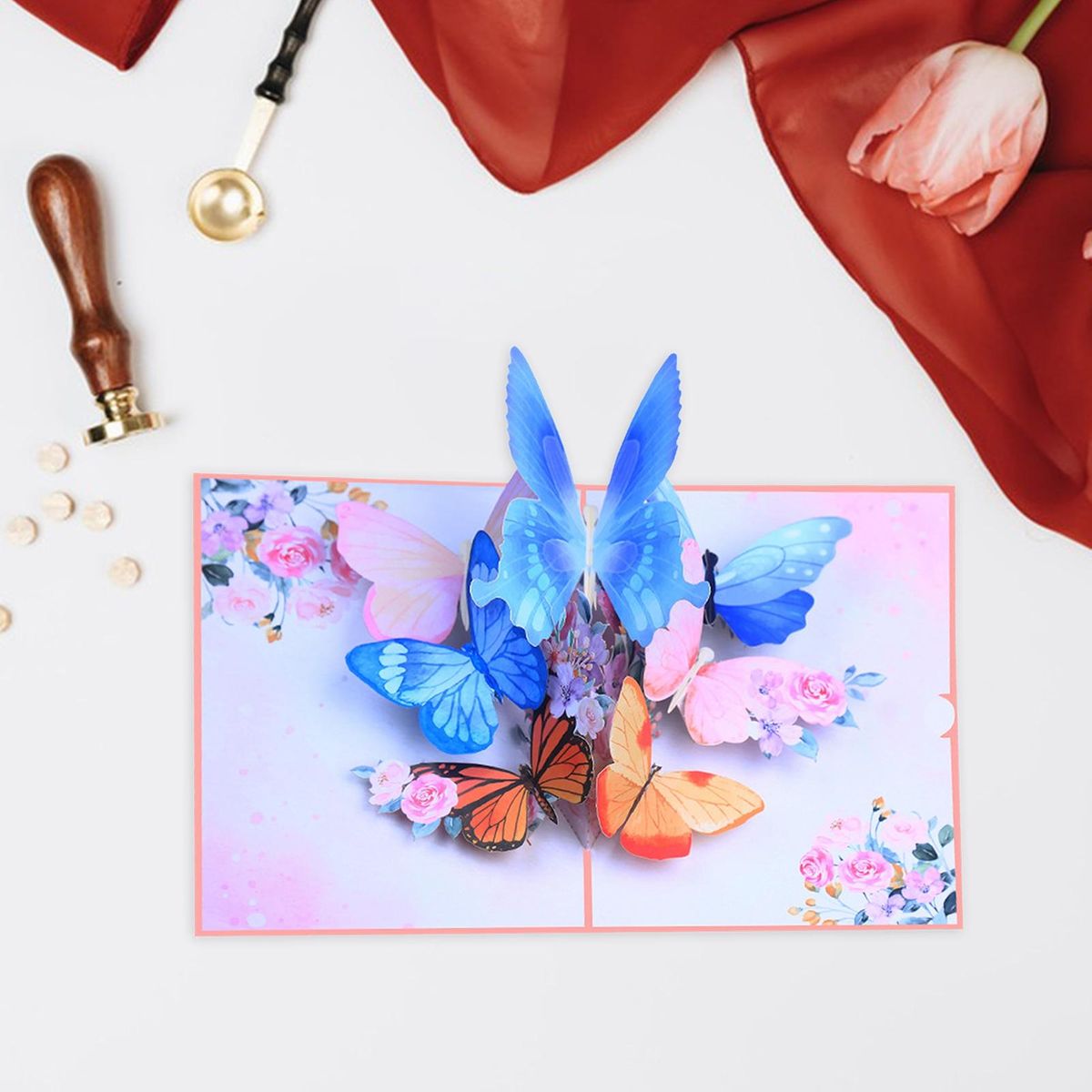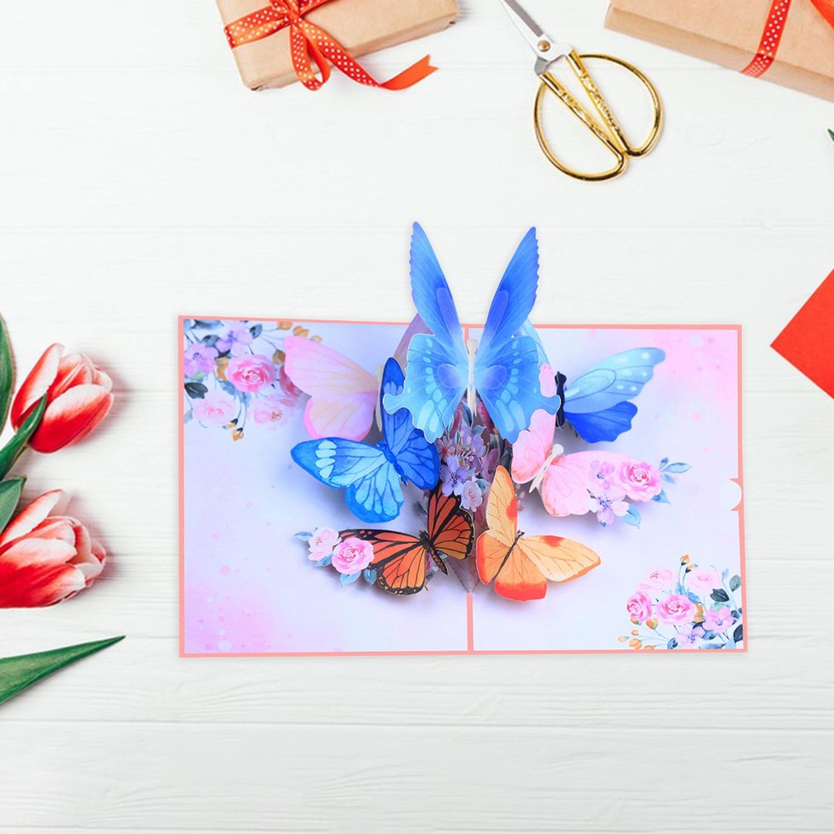Our stunning butterfly pop-up greeting card, a true masterpiece that will captivate the hearts of butterfly lovers of all ages. the cover showcases a beautiful illustration of a flock of colorful butterflies in flight, setting the stage for an enchanting surprise inside. as you open the card, you'll be greeted by a vibrant scene of dancing butterflies amidst scattered flowers, creating the illusion of being in a breathtaking garden. this exquisite card is more than just paper; it's a tangible expression of love, gratitude, care, and connection that brings joy and comfort to people's lives.