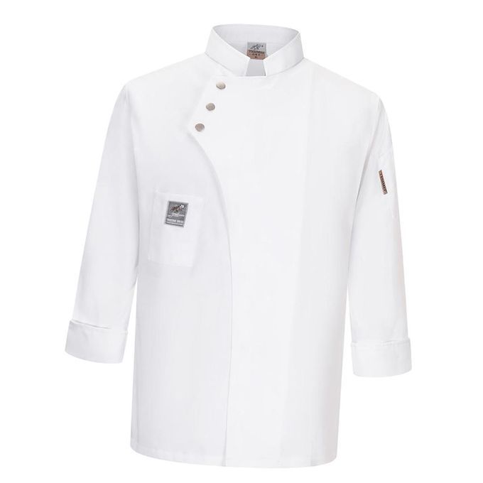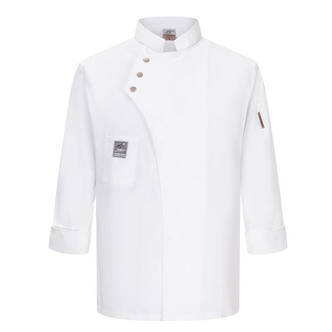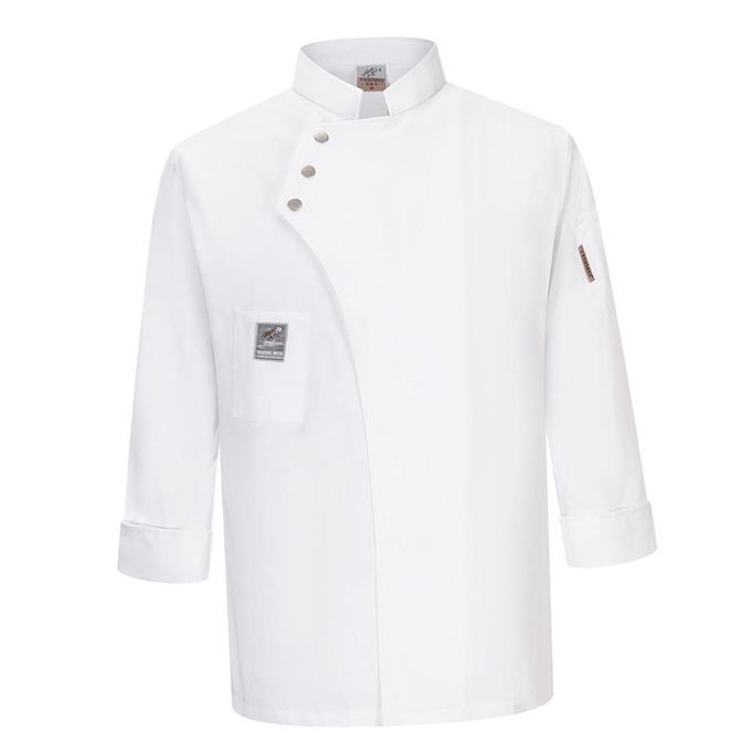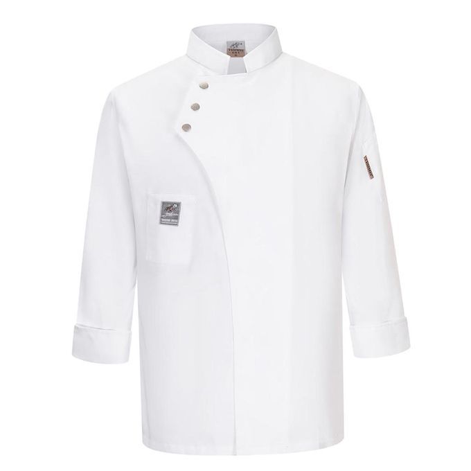 Solid color, single-breasted and long sleeves chef shirt, having left shoulder pockets and right pockets, mandarin collar.