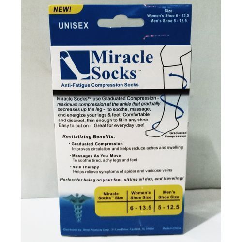 Miracle socks use graduated compression - maximum compression at the ankle that gradually decrease up the leg - to soothe, massage, and energize your legs and feet! comfortable and discreet, thin enough to fit in any shoe. Perfect for being on your feet, sitting all day, and travelling. Easy to put on.
