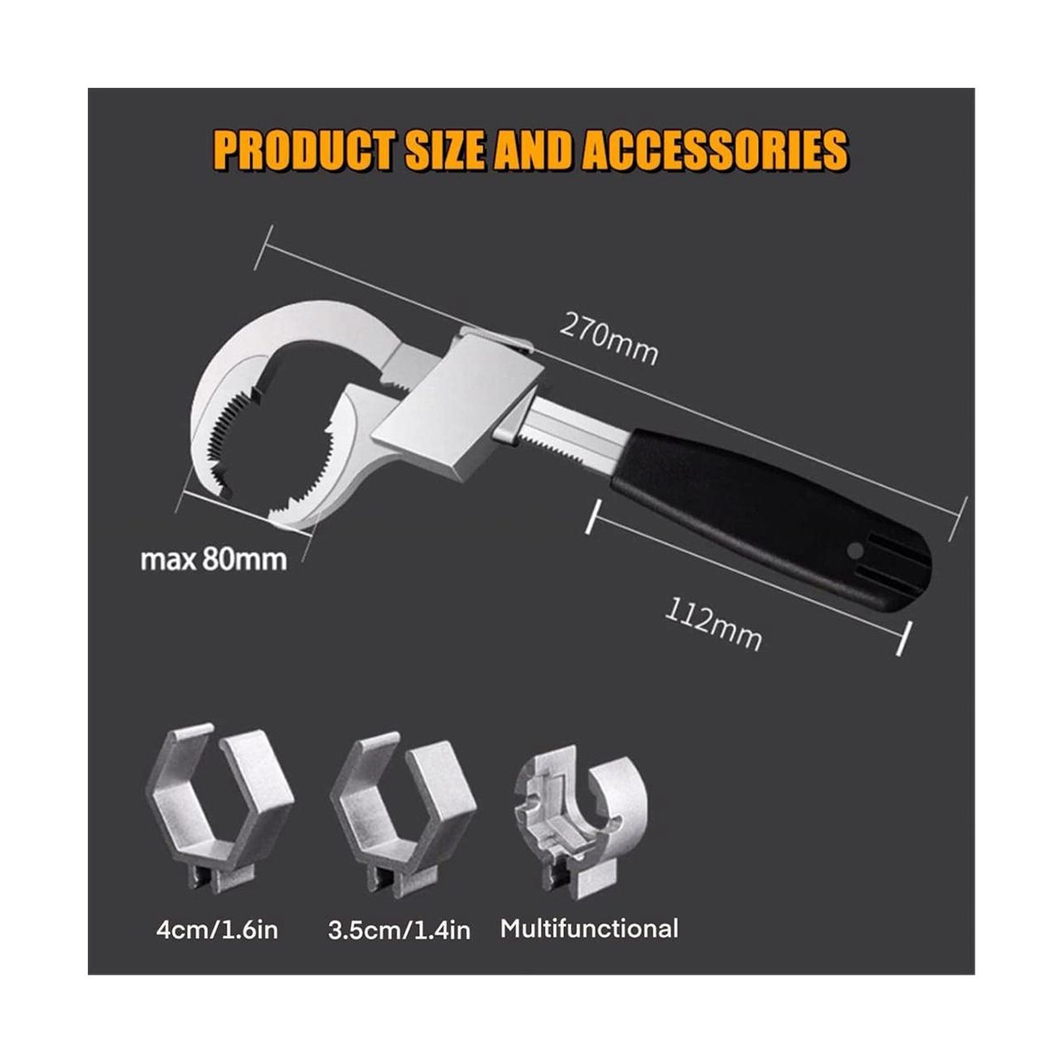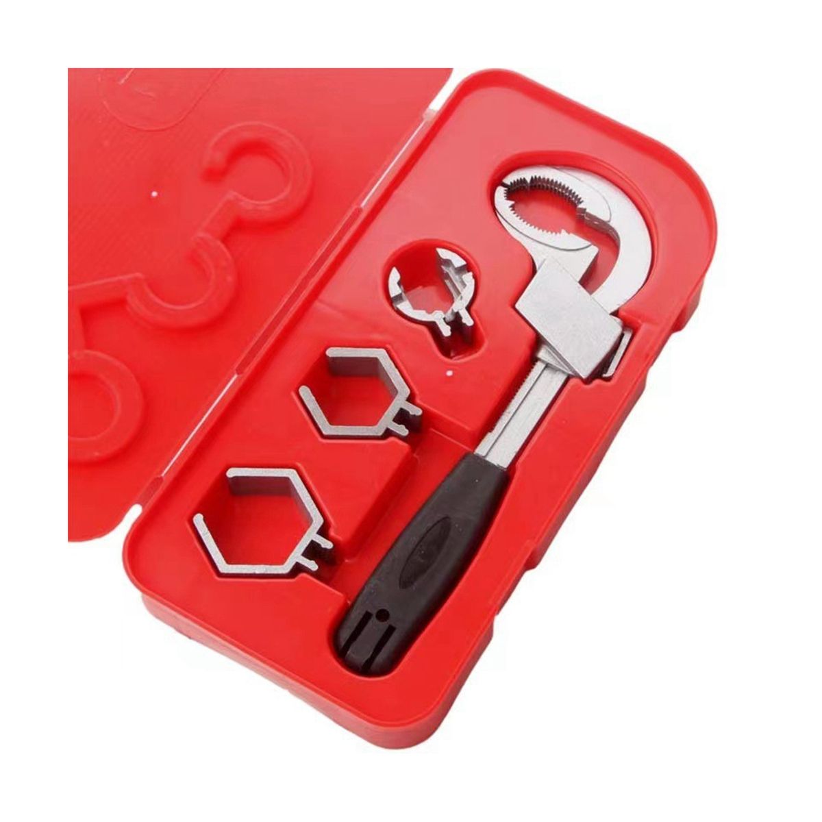 [3 in 1 Crescent Wrench]The adjustable wrench includes 3.5cm six-sided chucks , 4.5cm six-sided chucks and multifunctional round chucks. These three specifications card head fit 99% different size types of sink pipe fittings.