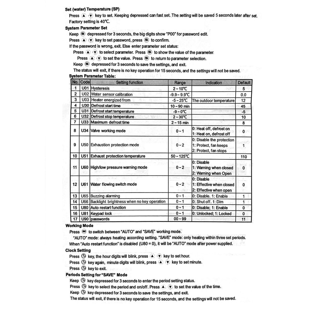 Winter Antifreezing & Auto Defrost & Timer Defrost Function: when the outdoor temperature is ≤ 2℃, it will operate anti-freezing pumping, the pump runs 3 minutes for every 30 minutes; it will automatically stop when ≥ 3℃. When the temperature is -9~0℃ starts defrosting, and when the temperature is 2-30℃ stops defrosting.