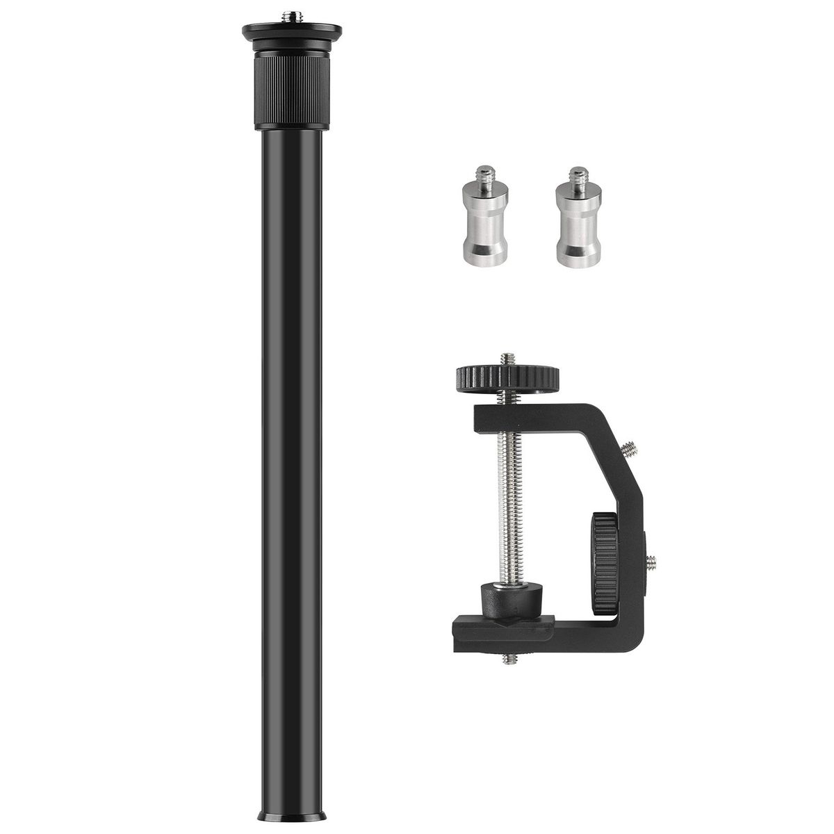 Clamp and extension rod with1/4 inch screw are compatible with camera, screws in different positions of clamp are convenient for more accessory attachment like microphone, video light, ball head, and more.