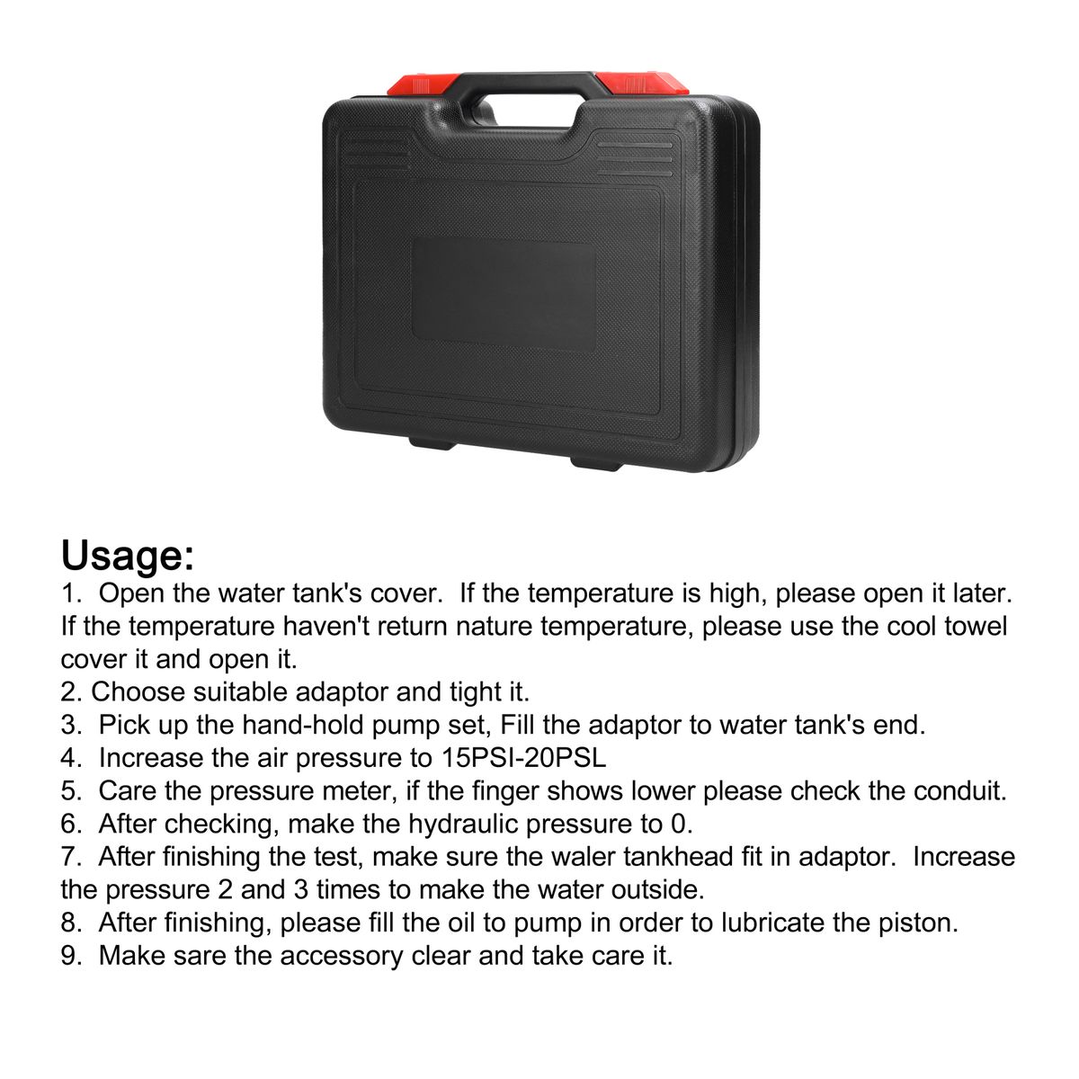 This car radiator tester kit is designed to obtain a premium cooling system, which has with different tools to make sure your car engine run in complex condition. This car radiator water tester kit can help you diagnosis trouble very quickly and easily, it will improve your work efficiency a lot. This machine supports worldwide vehicle models, and covers a variety kinds of car cooling systems. At the same time, it is user friendly, and with make sure it will satisfy your car maintenance request.