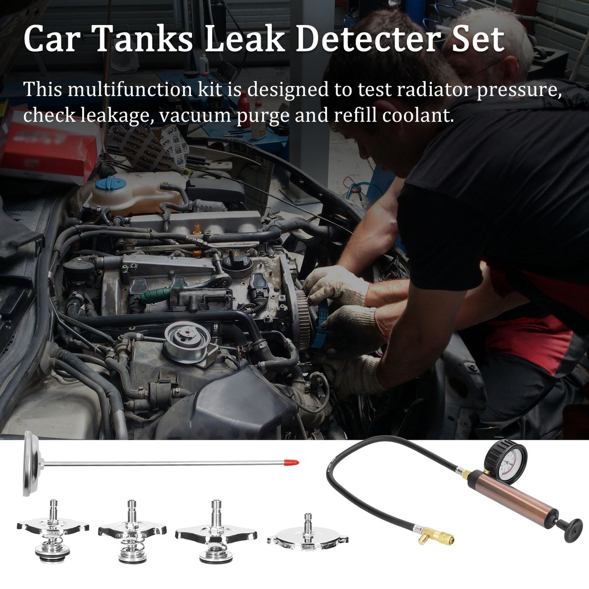 This multifunction kit is designed to test radiator pressure, check leakage, vacuum purge and refill coolant.