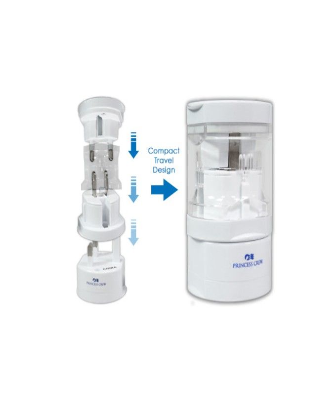 Universal Compact Plug Adaptor EU US UK AU . A smart and easy way to keep your devices powered up all across the globe. Compact, Multi-country Converter (this is not a stepdown or up converter) . All three converter plugs snap together in a neat "building block" cylinder, only 3.5 inches tall.