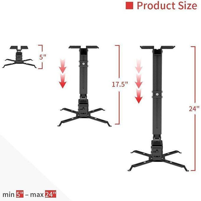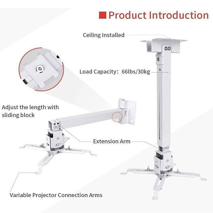 //////////////Describe:1.features a flexible mounting system that can be used with most projector models, and it has the versatility to attach to nearly any ceiling.2.The mounting interface features four double-jointed support ar ms that allow flexible positioning to reach almost any mounting point of the projector.3.Steel construction; Maximum loading 66 lbs (30 kgs); Rotate adjustment left and right 15 degrees4.This allows the projector to be mounted at an adjustable height from the ceiling. The projector mount can be installed on the wall or the ceiling. Exclusive ""No-slip"" adjustment system; Lock in any position; Easily release and lock.//////////////Tips:Add the product to your wish list, follow Pearroc store, after purchase, we will give priority to delivery processing.Due to the different reasons of various display screens, the product will have a little color difference, but don't worry, the product is perfect.The product is transported by air, and the high air pressure causes the battery power to drop. It is recommended to fully charge the product after receiving the product.The use steps are explained in detail in the product manual.For more surprise gifts/shop rebates/massive gifts, please pay attention to Pearroc store.In order to better help others understand this product, please share your experience in the evaluation. Pearroc store will extract excellent evaluations from it every month and give a 100Watts solar panel as a gift.