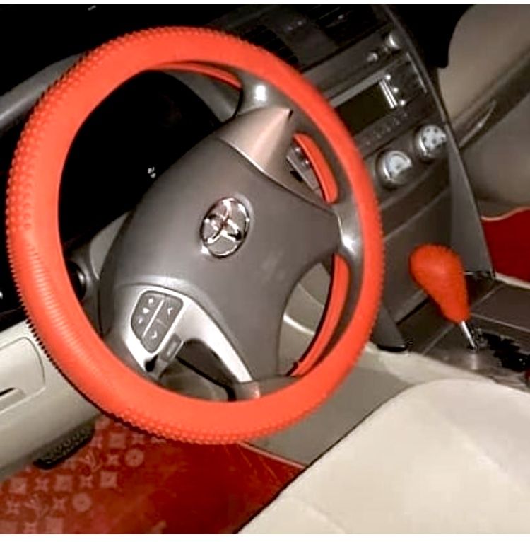 It's a universal steering wheel cover with gear knob cover that's suitable for any car type, it's elastic/ expandable to fit your wheel/gear knob size it's made from silicone. It's high quality, long lasting. It has a very good hand grip