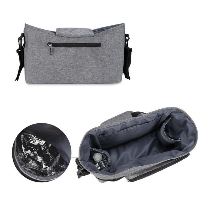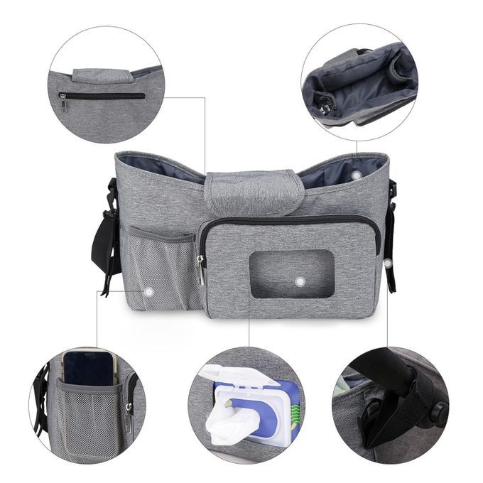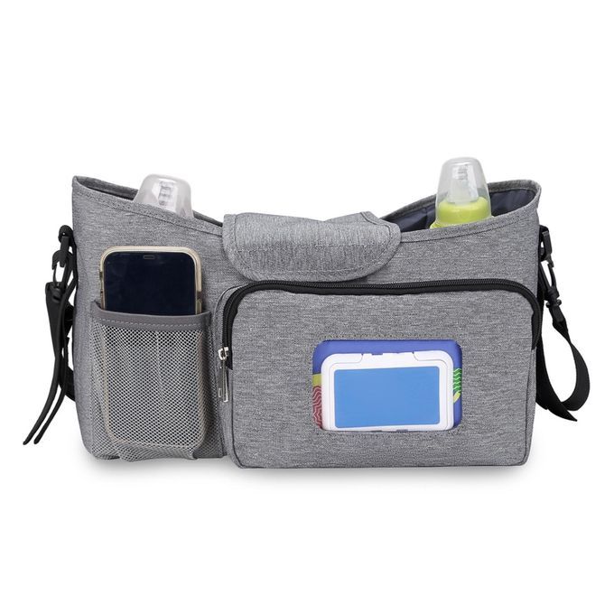 Large capacity, with bottle holder for storing baby bottles or cups, the mesh pocket for baby paper towels, with an large area for bay diapers, toys, foods, the side pocket is for mobile phone.