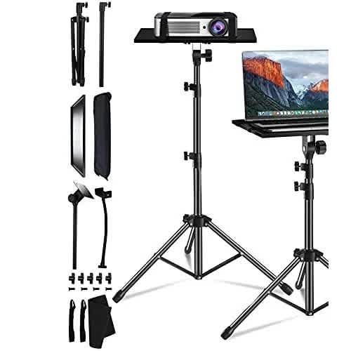 Adjustable Tripod for Projector Heavy- duty tripod bracket can quickly and easily adjust the height from 17.7''to 47.2''.Tray adjustment of 300o.The tray has raised support lips, and sponge gaskets and elastic bands to protect electronic equipment. Clip-type knobs and elastic bands hold the shelf and tray in place.