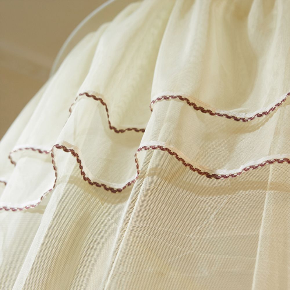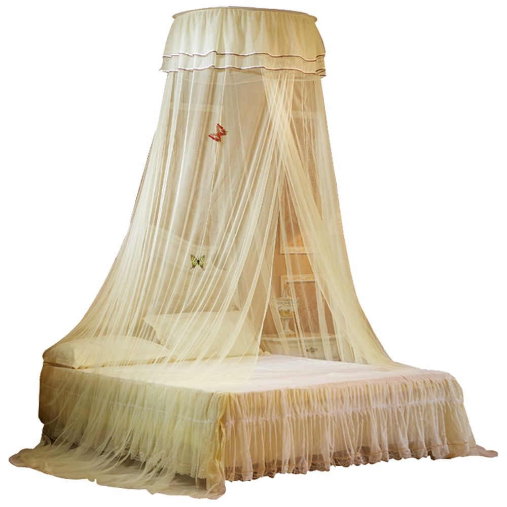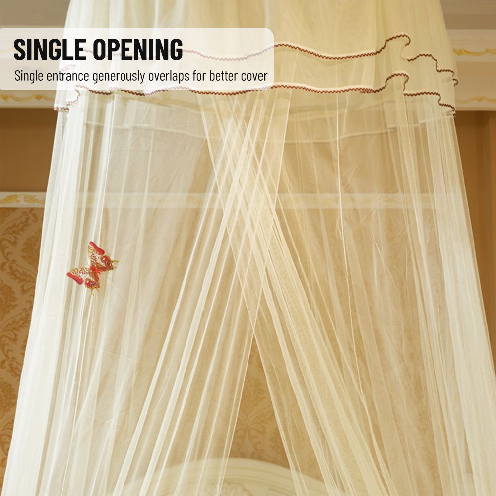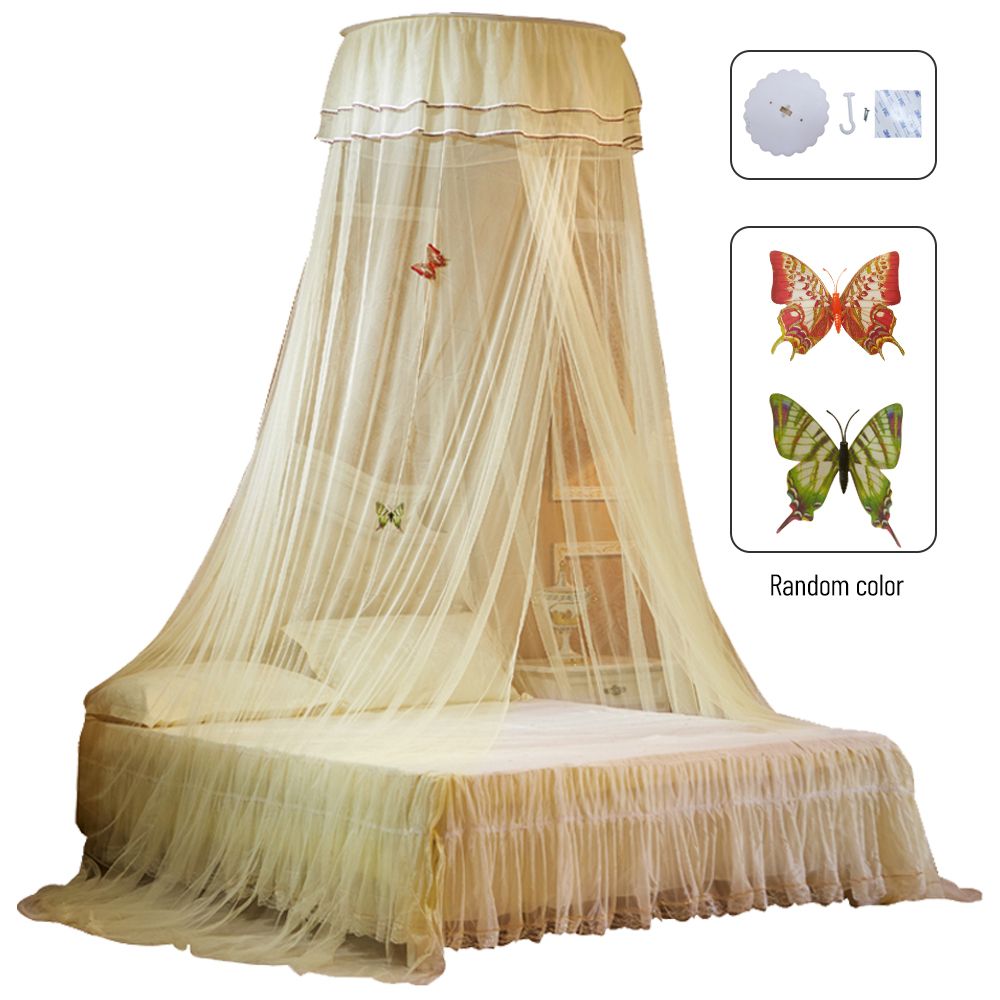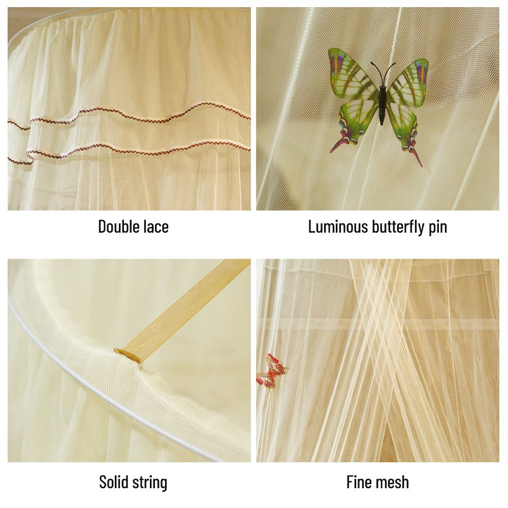Our bed net with heightening dome, double lace and luminous pins will bring a touch of elegance to your bedroom. Its fine mesh effectively prevents unwanted organisms from entering and 100% polyester fabric is breathable, lightweight and safe. You can install it easily into the ceiling with the provided accessories. Have a good night's sleep with this simple yet luxurious bed canopy!