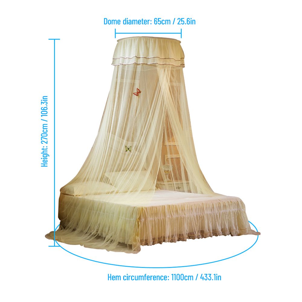 ——270cm H, hoop measures 65cm / 25.6in in diameter and the hem circumference is around 1100cm / 433.1in, this universal bed canopy is applicable to bed size from 1.2m / 47.24" to 1.8m / 70.86".