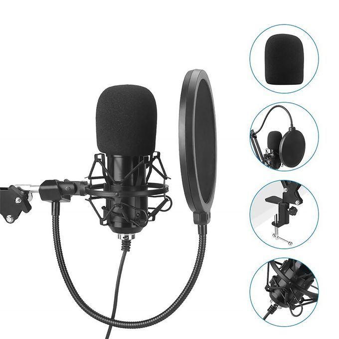 With the kit, you will get the boom stand, the shock mount, po p filter, USB cable, two microphones, as you seen on the picture. (The boom stand is flexible and adjustable in 360 degree and gets the mic in the right position for you work extremely well once tightened they don't loosen up by themselves and overall it's a great piece to help you save some space on your desk or in your room. The po p filter wire you bend it to the position you needed to be and it'll stay that way. The shock mount is lightweight and sturdy, which pretty much fits on any microphone that are around the size of the microphone that comes with this package and it does its job by absorbing any vibrations coming from the boom stand.)