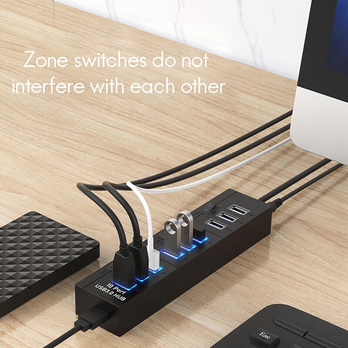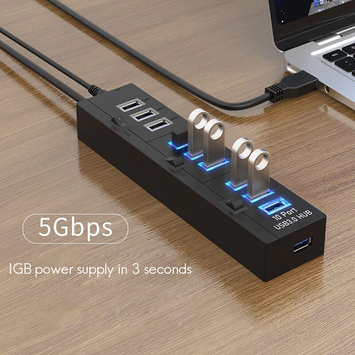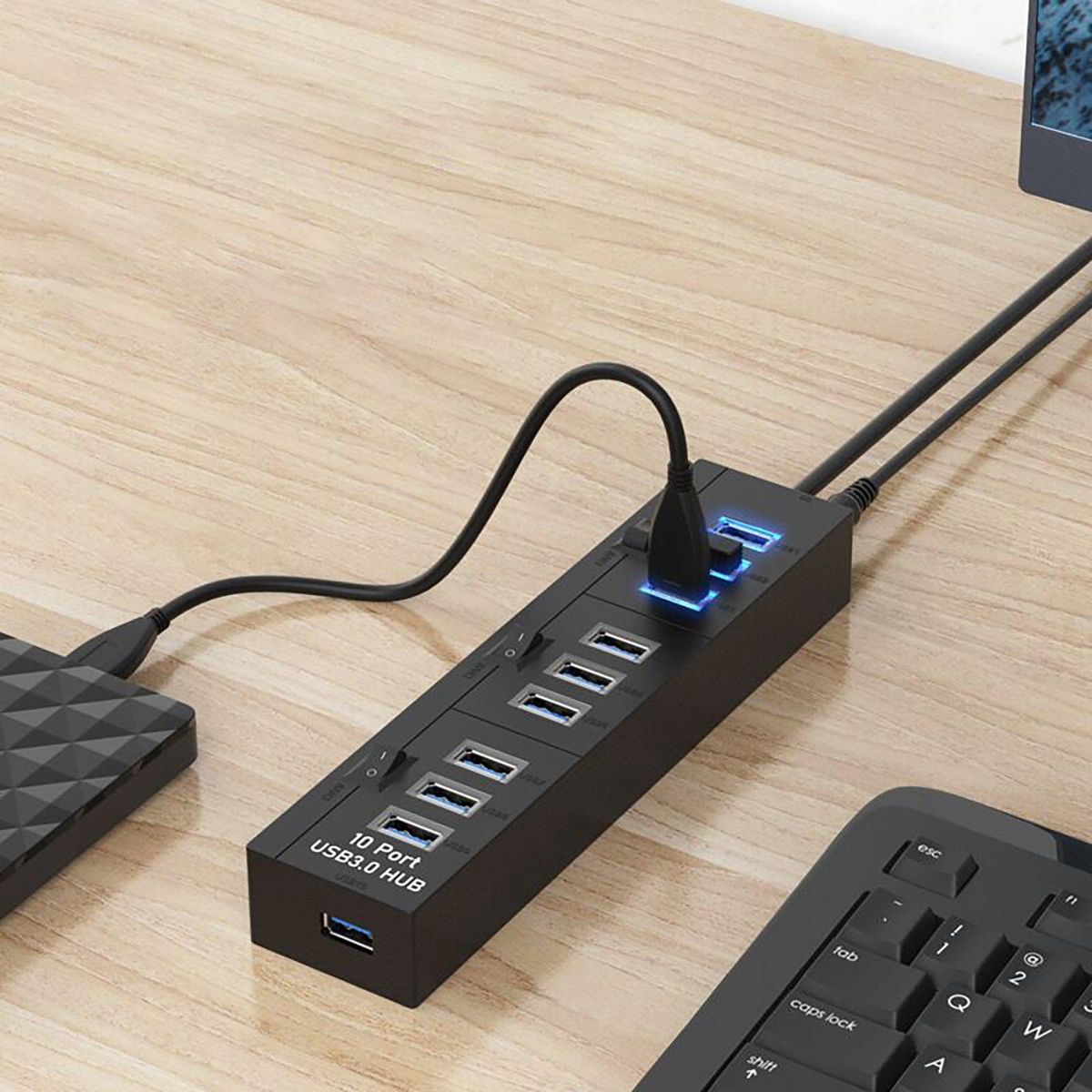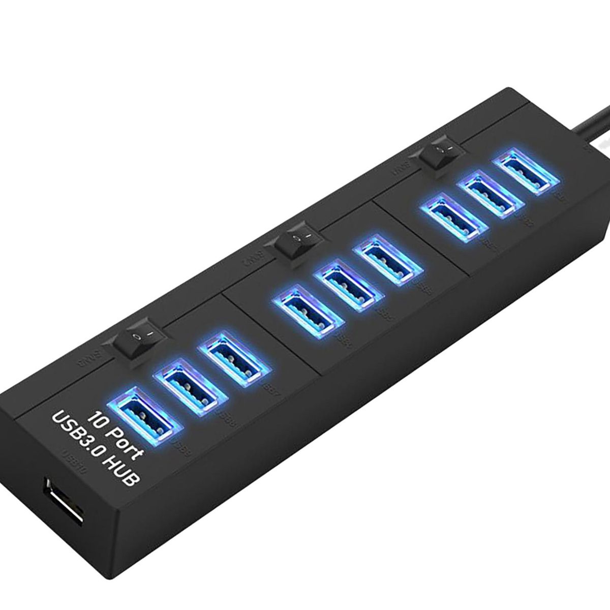External USB3.0 ten-port hub. Plug and play