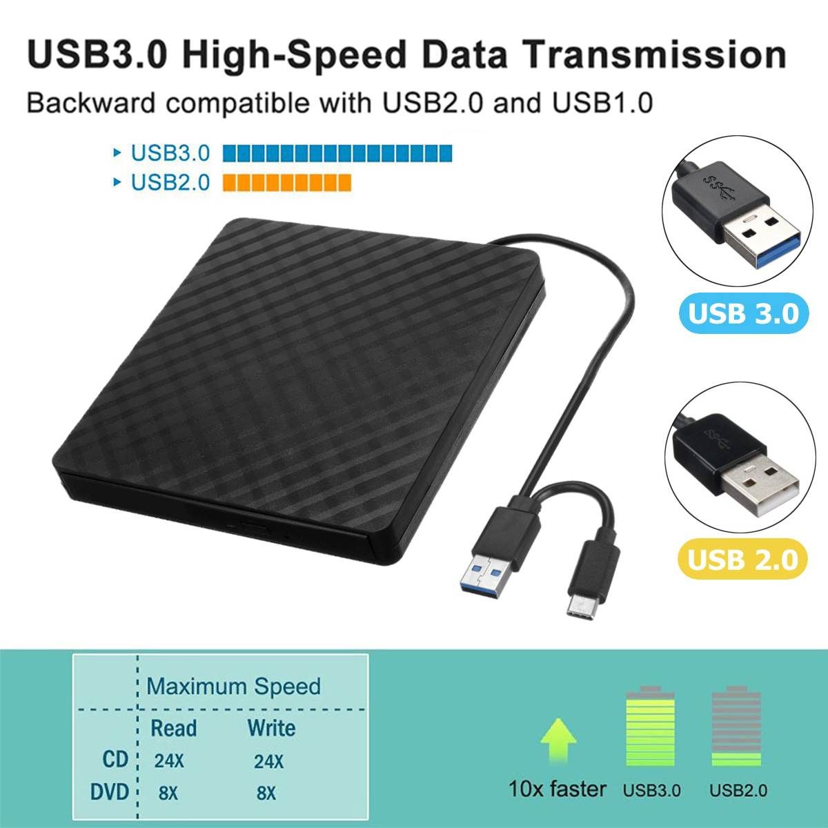 USB 3.0 Type C External CD DVD Drive Dual Port DVD-RW Player Portable Optical Drive Burner Writer Rewriter High Speed Data Transfer for PC Laptop OS Windows 7/8/10