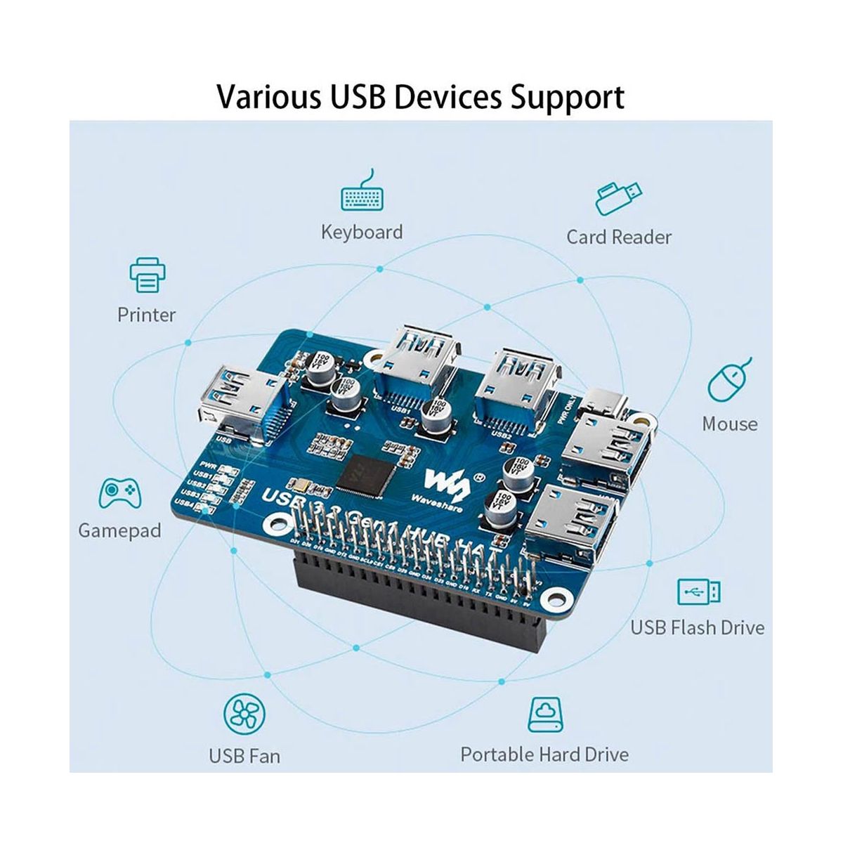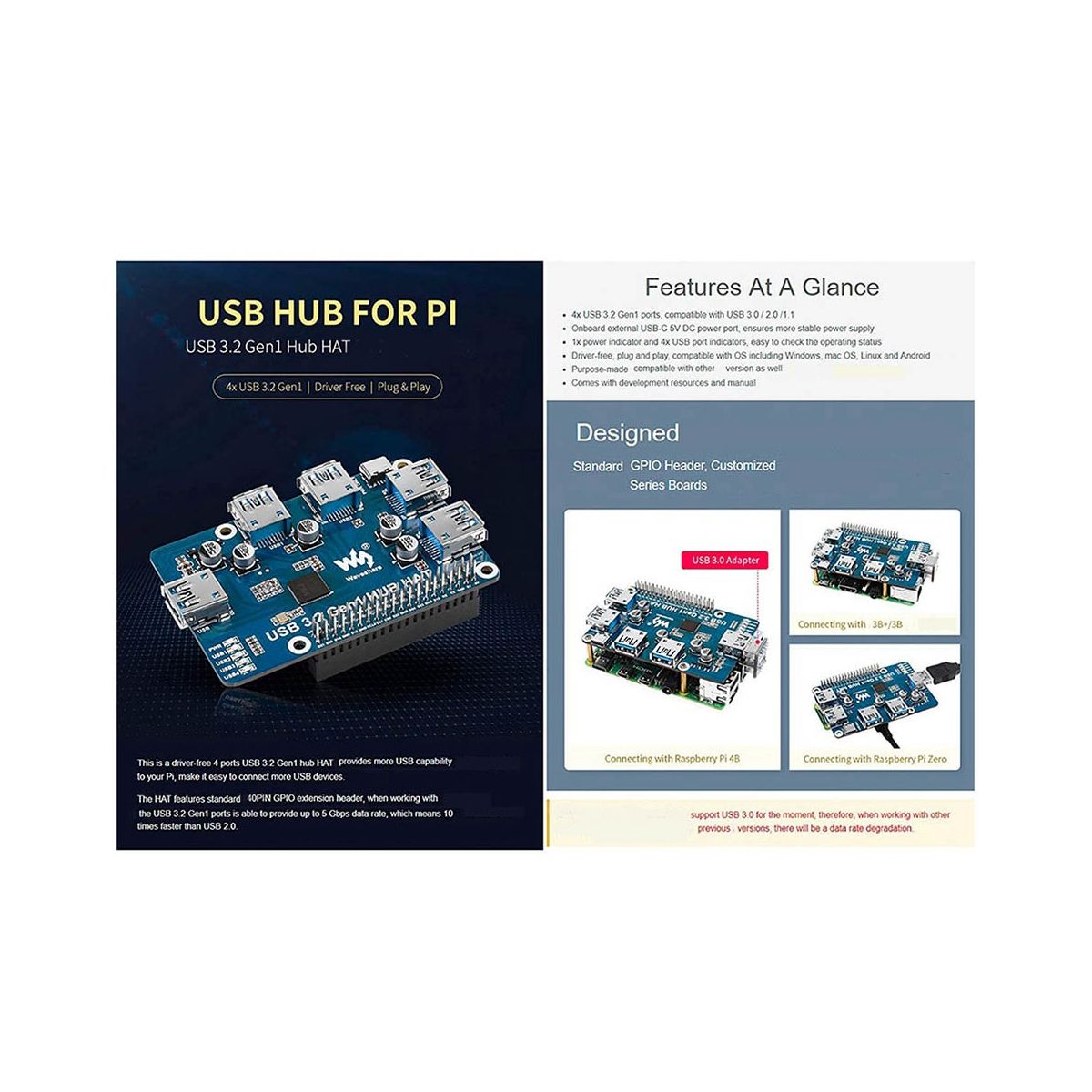 This is a driver-free 4 ports USB 3.2 Gen1 hub HAT for Raspberry Pi, provides more USB capability to your Pi, make it easy to connect more USB devices.