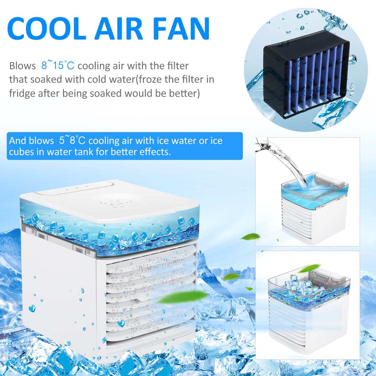 Cool Air Fan -- Blows 8~15℃ cooling air with the filter that soaked with cold water (froze the filter in fridge after being soaked would be better); and blows 5~8℃ cooling air with ice water or ice cubes in water tank for better effects.