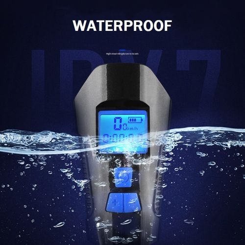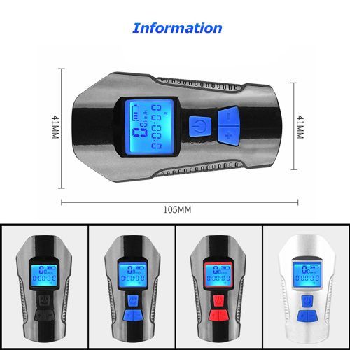 Features:Function: Light with speed meter/horn/battery status4 light modes: high bright, low bright, flash, yellow light6 horn ring: whistle, alarm, trumpet, didi, jiji, jiujiuLithium battery inside, 2-3 hours charge, can use 3-5 hours. Specification:Size: 10.5x4.1cmWeight: approx. 170gMaterial: ABS Package include:1 x Bicycle Light