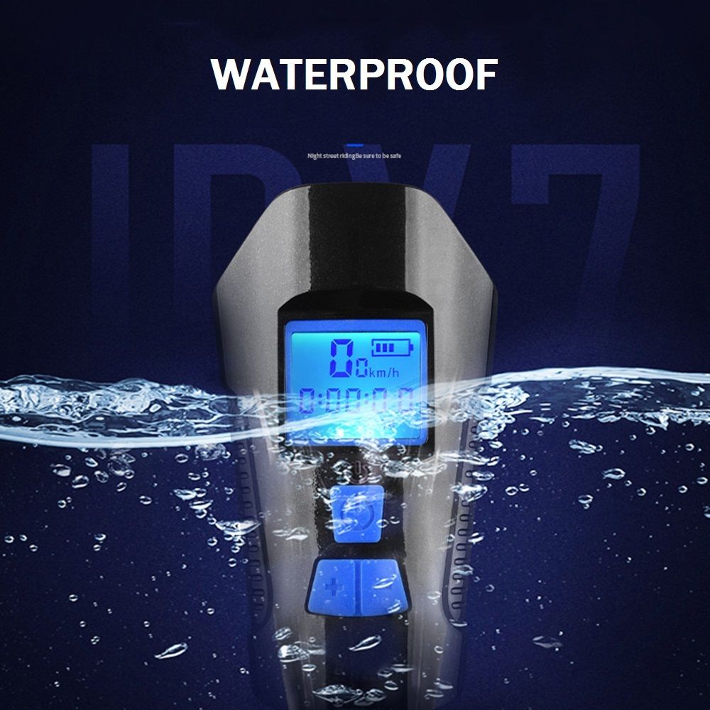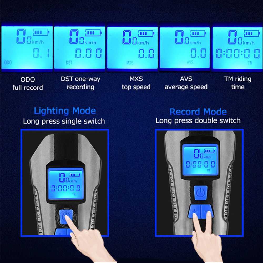 Features:Function: Light with speed meter/horn/battery status4 light modes: high bright, low bright, flash, yellow light6 horn ring: whistle, alarm, trumpet, didi, jiji, jiujiuLithium battery inside, 2-3 hours charge, can use 3-5 hours. Specification:Size: 10.5x4.1cmWeight: approx. 170gMaterial: ABS Package include:1 x Bicycle Light
