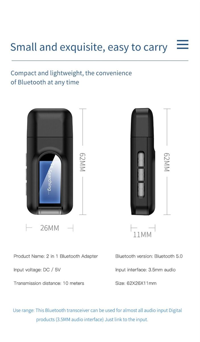 2 in 1 Bluetooth Transmitter & Receiver, as a Bluetooth Audio Transmitter, It is specially designed for the Audio Devices (such as MP3, MP4, TV and PC, etc.) without Bluetooth function. You can connect the Bluetooth Transmitter to the audio devices without Bluetooth function via the included 3.5mm Audio Plug, changing these audio devices into Bluetooth-enabled audio devices, and making it work with Bluetooth-enabled Headset and Speaker; as a Bluetooth Audio Receiver, It is specially designed for Car Stereo systems and Home Audio System. It can change the traditional Car Stereo systems and Home Audio System into Bluetooth-enabled ones, and easy to pair with Bluetooth-enabled Smart Phones, laptop, tablet, etc. With this product, you can greatly enjoy music from your phone, laptop, tablet without the hassle of cables.