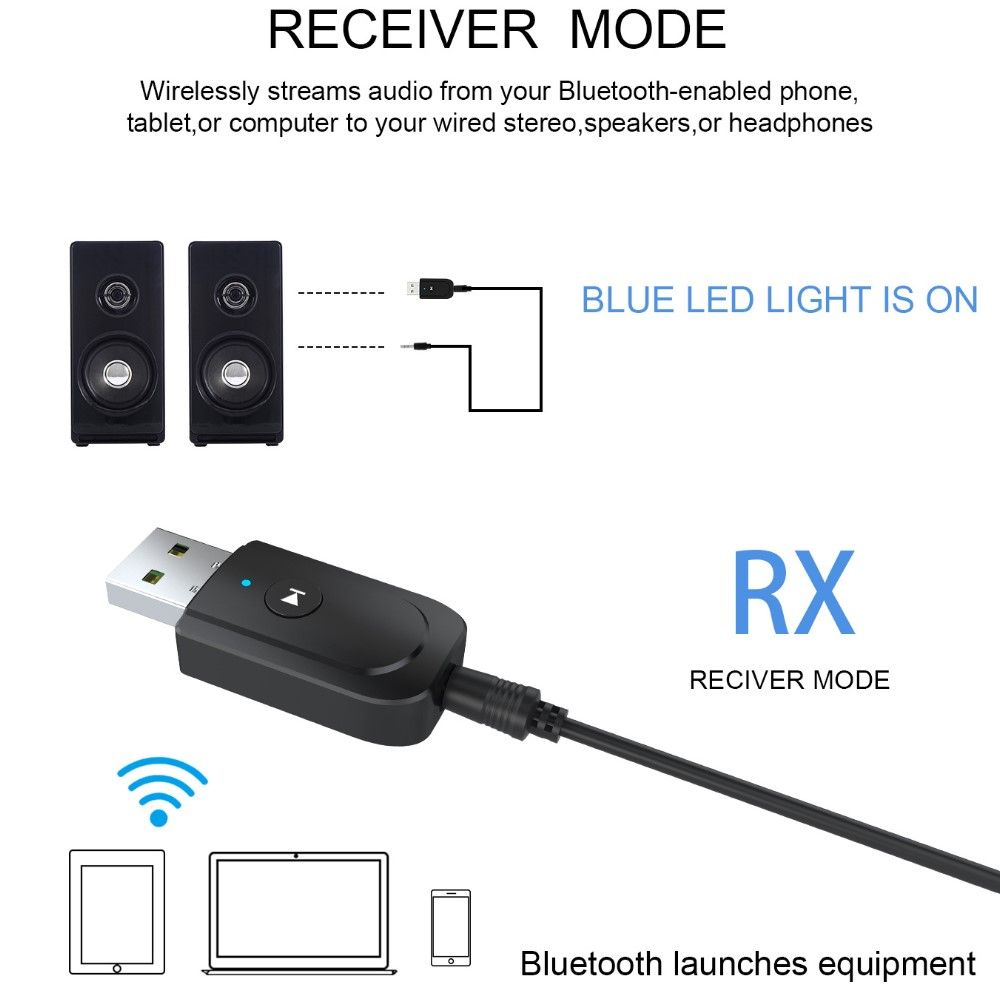3.Receiver Mode (RX): Wirelessly transfer audio from your Bluetooth-enabled phone, tablet, or computer toyour wired stereo, speakers, or headphones.