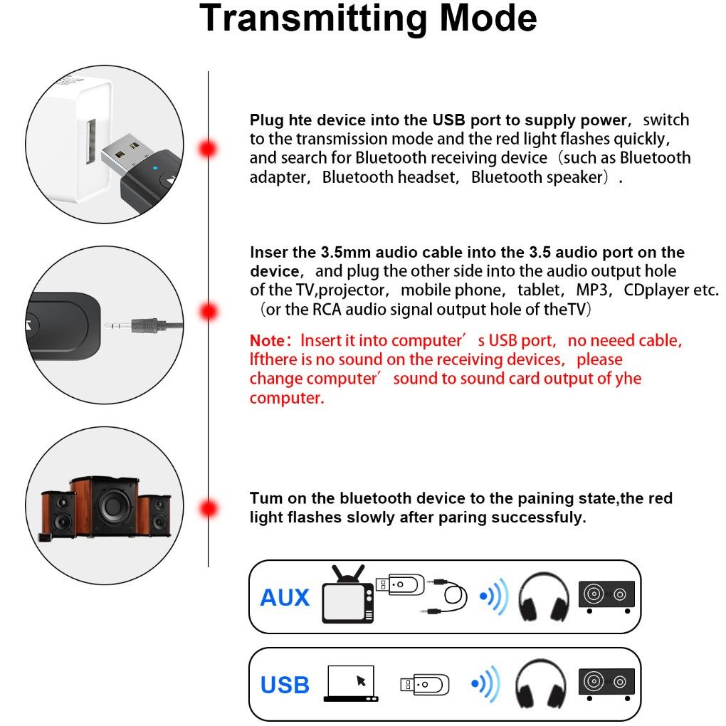 2.PC Audio Transmitter Mode: Wirelessly transfer audio from the PC, notebook to Bluetooth headset or speaker through USB port, no audio cable is required.