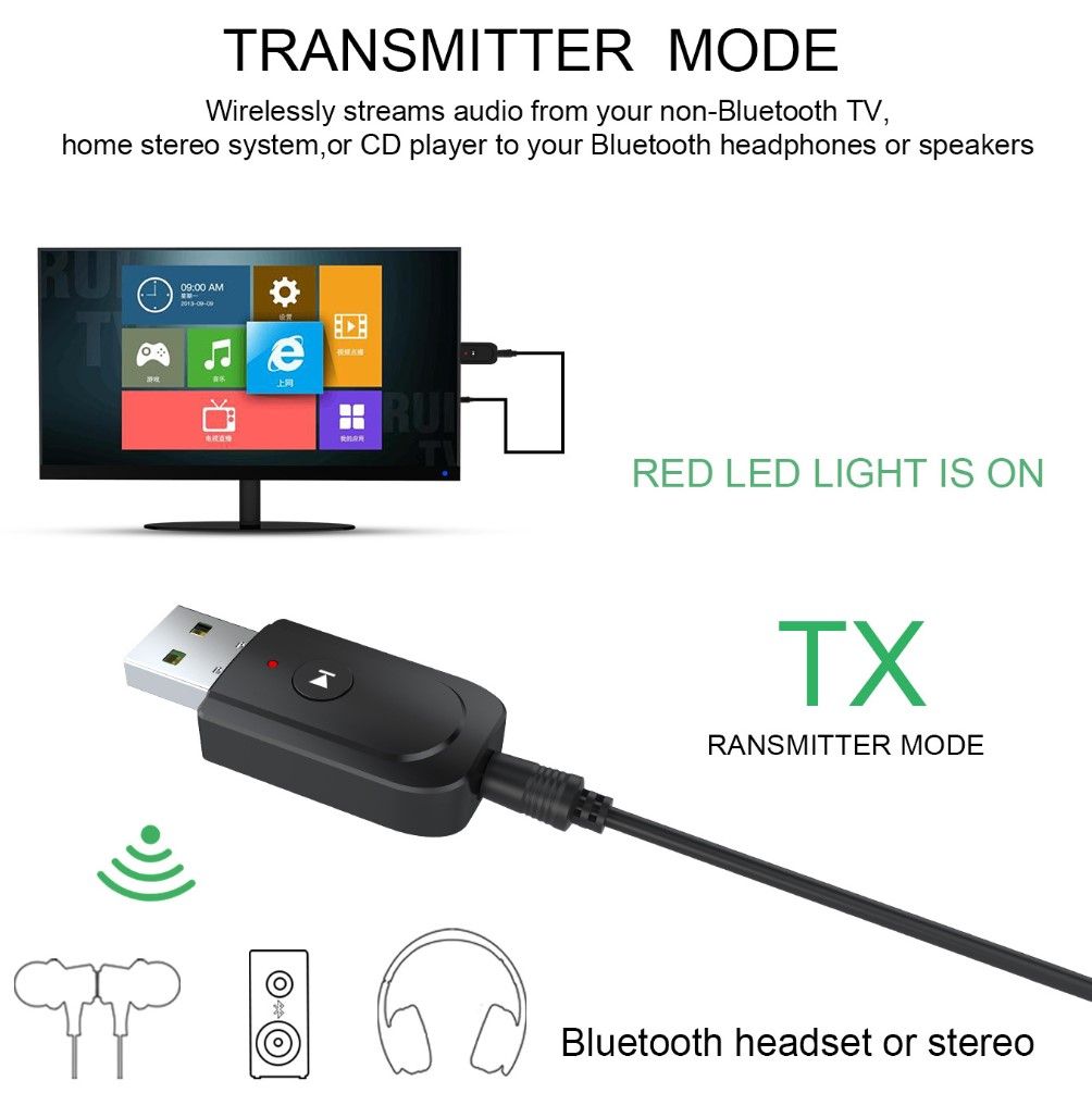 1.Transmitter Mode (TX): Wirelessly transfer audio from your non-Bluetooth TV, home stereo system, or CD player to your Bluetooth headphones or speakers.