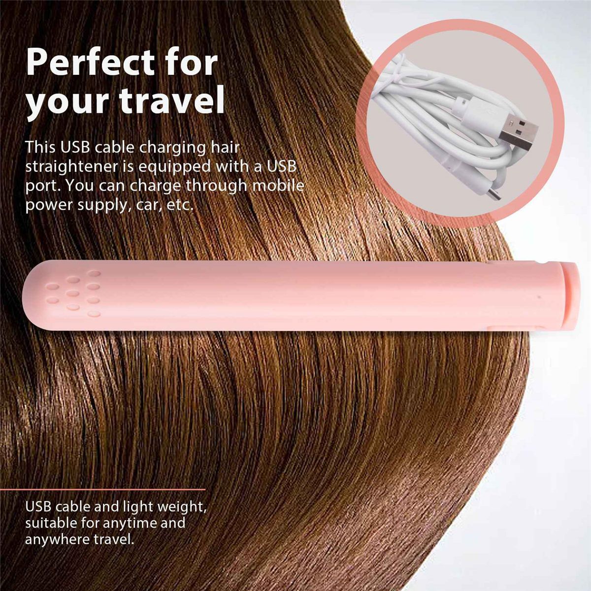 Perfect for your travel: This USB cable rechargeable hair straightener is equipped with a USB port and can be used worldwide. You can charge by mobile power, car, etc. USB cable and light weight, suitable for traveling anytime, anywhere.