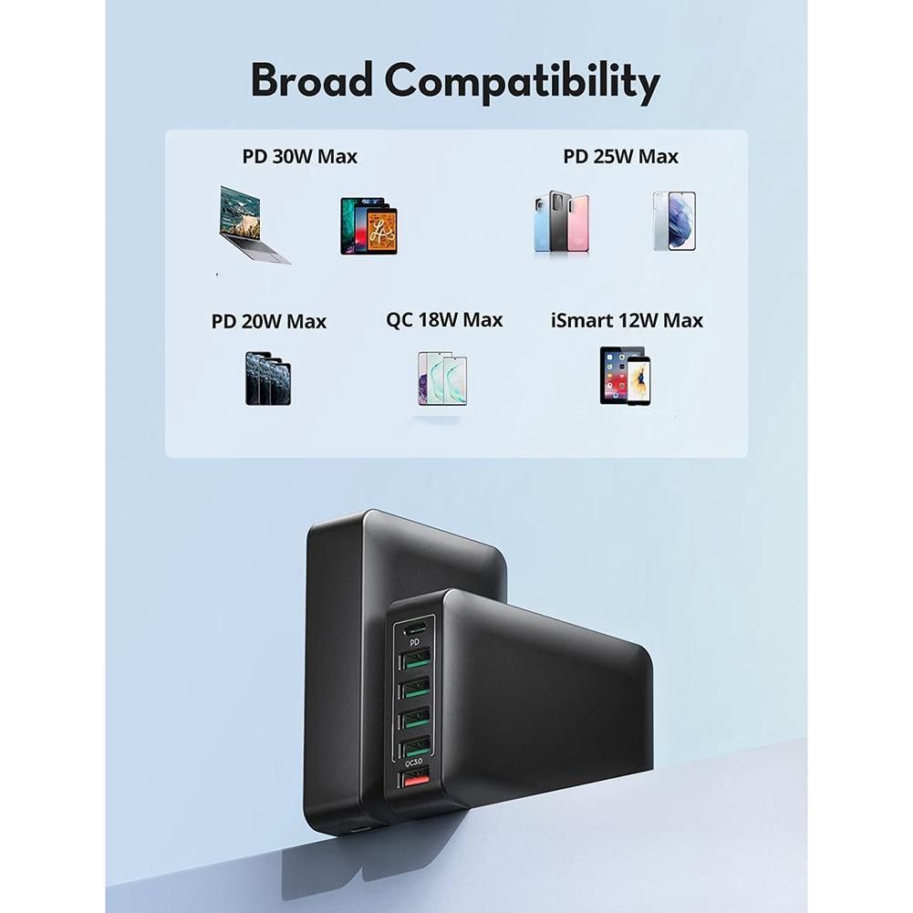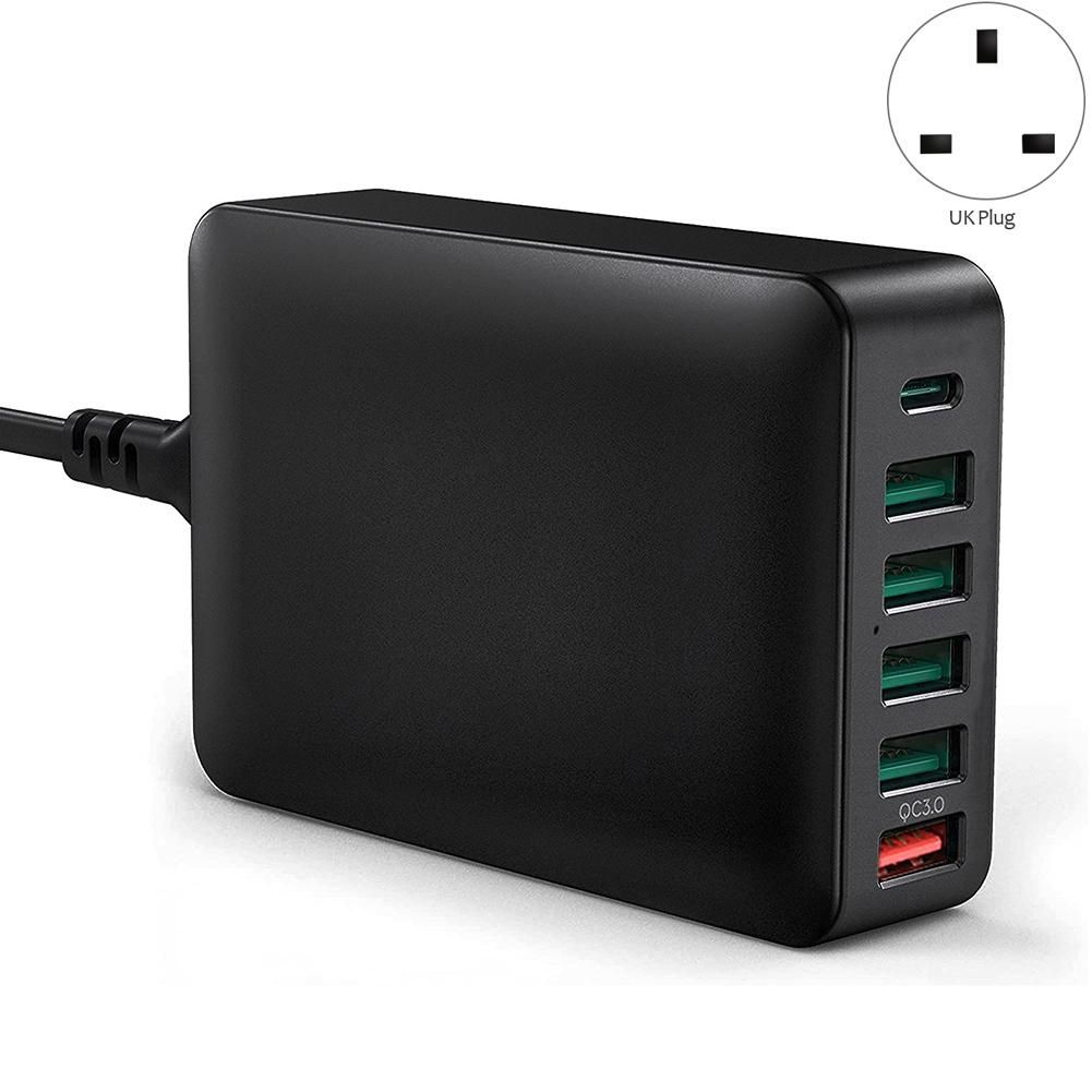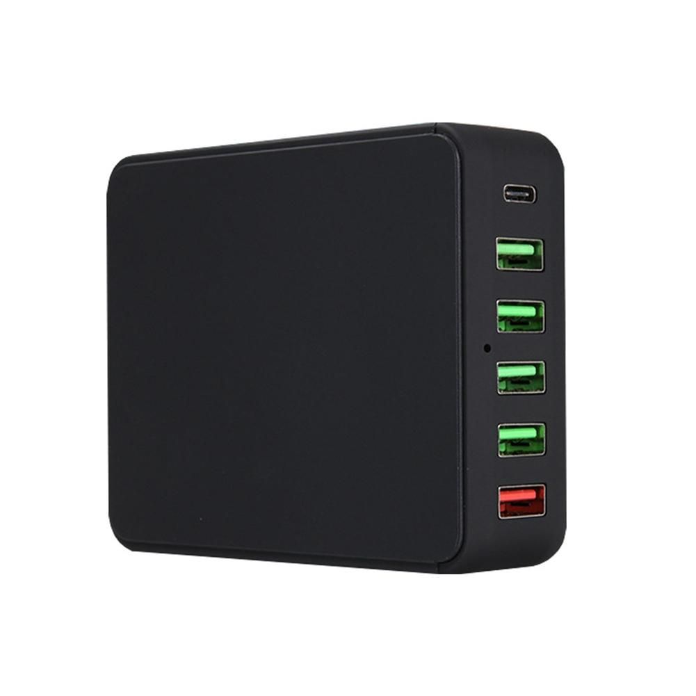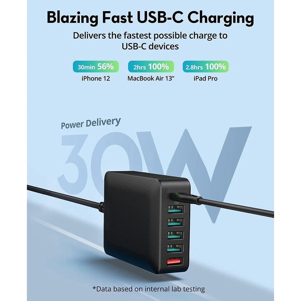 Extra strong 6 ports - conveniently charge up to 5 USB-enabled and 1 Type C devices at the same time such as for iPhone, smartphone, tablet PC with the optimal charging speed. advantage from up to 2. 4 A per output (total 12 A) for all your devices.