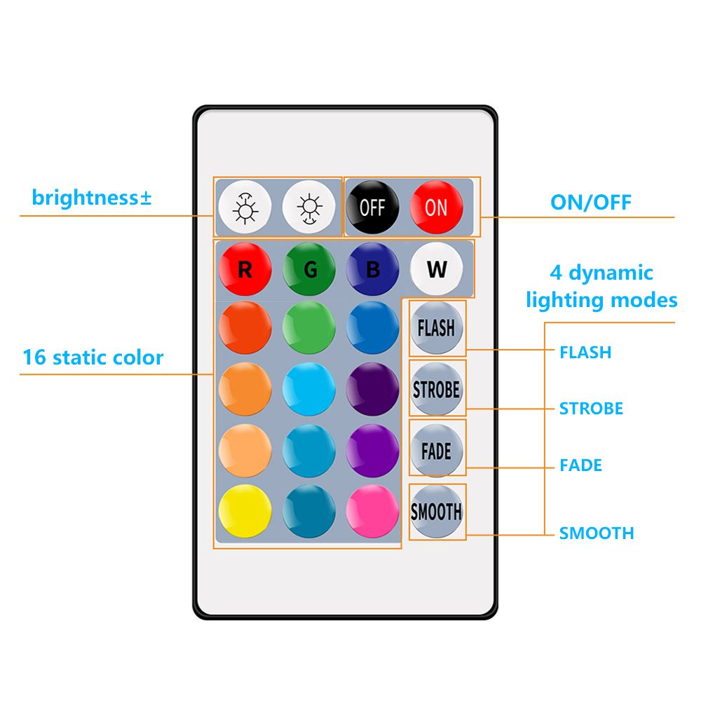 Features:16 RGBW colors with 4 lighting modes, brightness adjustable by remote control.