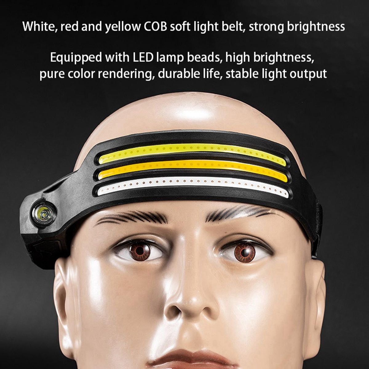BRIGHT : Large area of high brightness LED COB, expand your vision, make the night more bright. with wave sensor switch, suitable for any situation.BATTERY POWERED: Built in 1500 mAh battery, USB input charging. An adjustable headband makes running comfortable to wear.LIGHT MODES: Our Head Lamp has 2 light modes of brightness to meet your daily needs: COB High, and COB Low. Press and hold the switch for 2 seconds, the white and yellow light is always on, and press it again to strobe flash.LIGHTWEIGHT & ADJUSTABLE HEADLIGHT: The headband is easily elastic and secure that won't loosen up or flop around, waterproof designed headband light perfect for long distance runners or anyone else looking for a comfortable fit.WIDELY USED This portable headlight is suitable for many applications such as camping, running, working, hiking, or anything else you need a powerful hands free light.