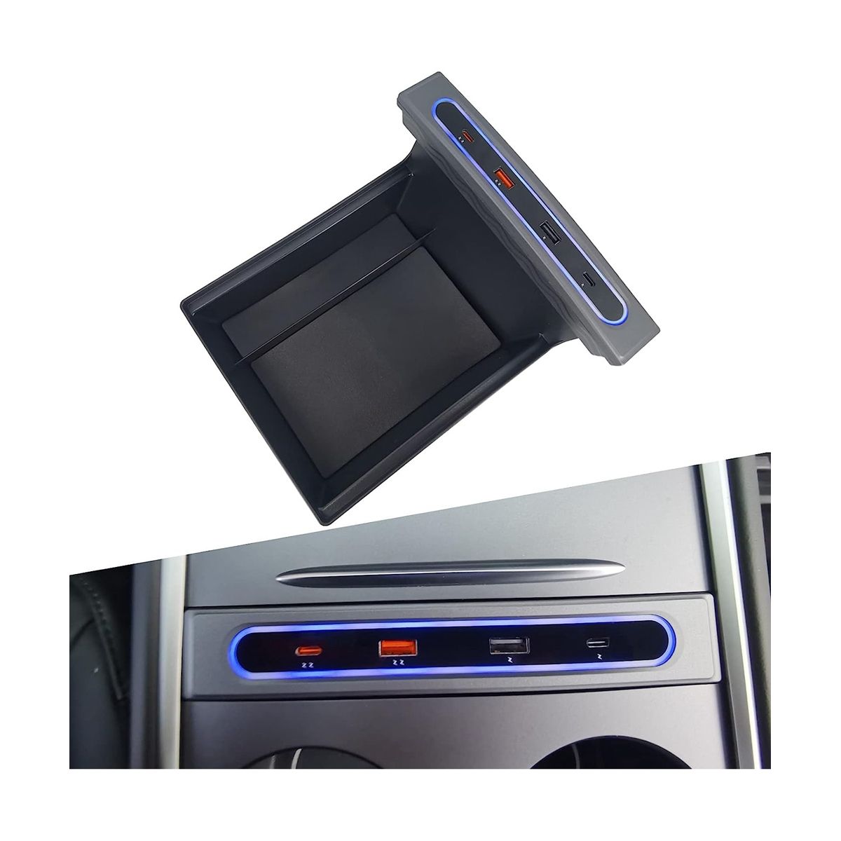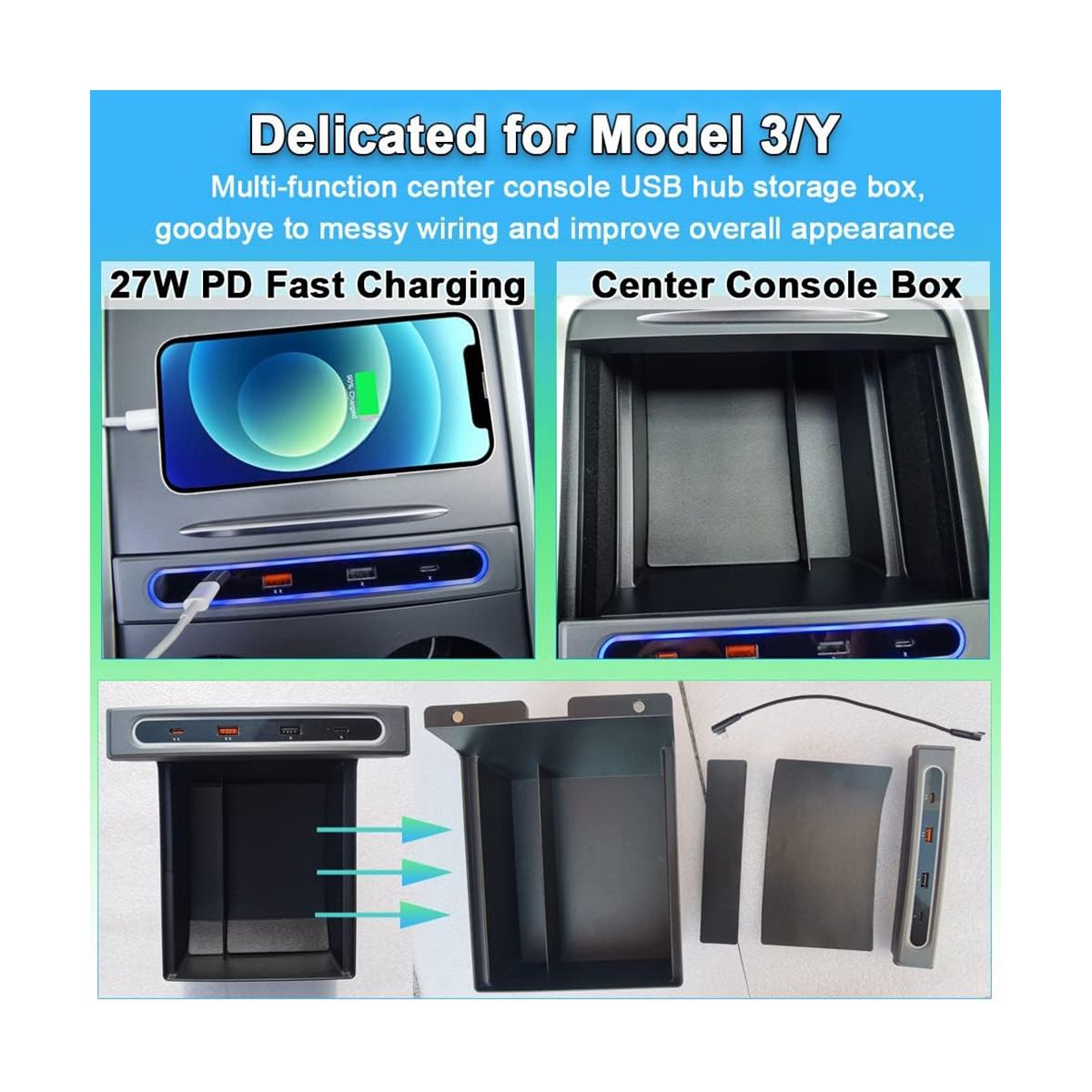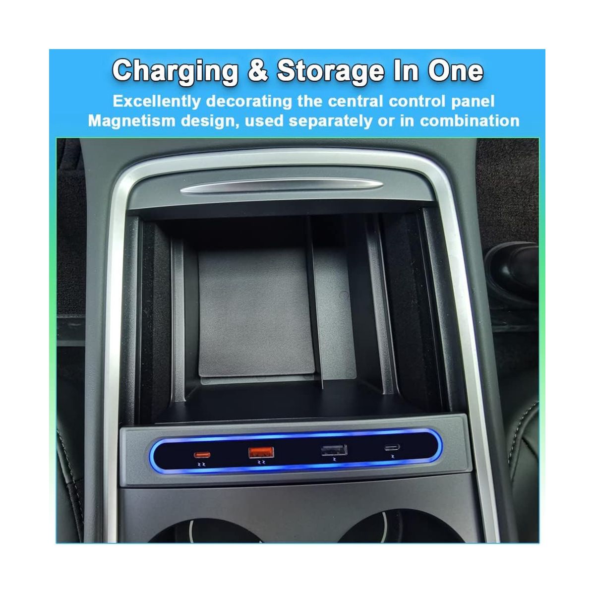 [Convenient and Efficient]USB Hub & Center Console Organizer is the perfect accessory for your Model 3 Model Y Accessories, providing fast charging, LED light, and a magnetic suction design that can be used individually or together.