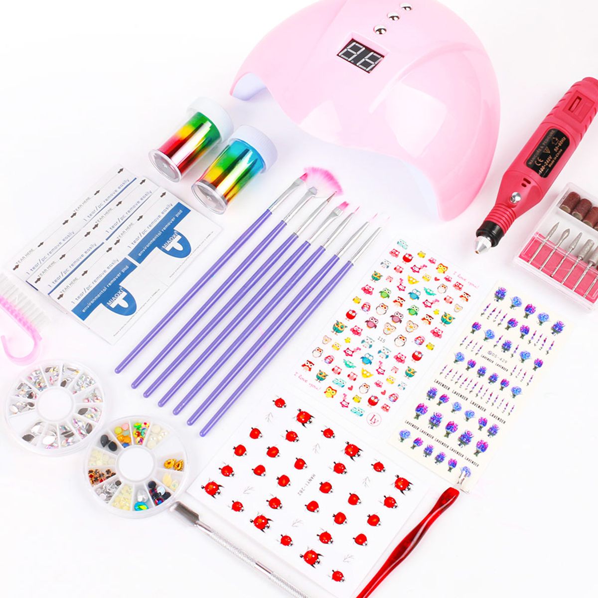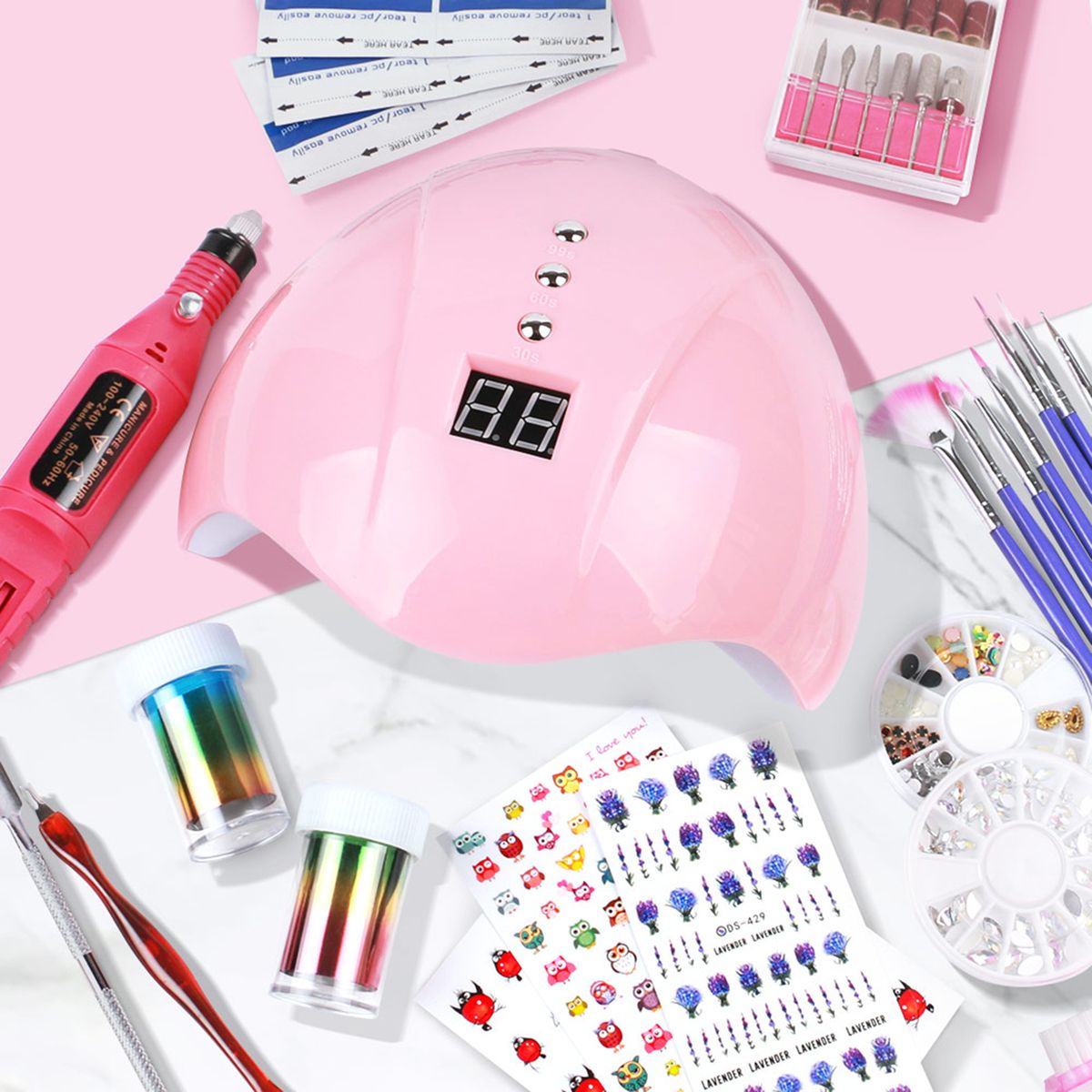 The complete set of nail tools for easy diy design. The nail lamp, nail drill machine, nail decor and nail tools all provide for you, easy to use. With them, you can create some beautiful nails.