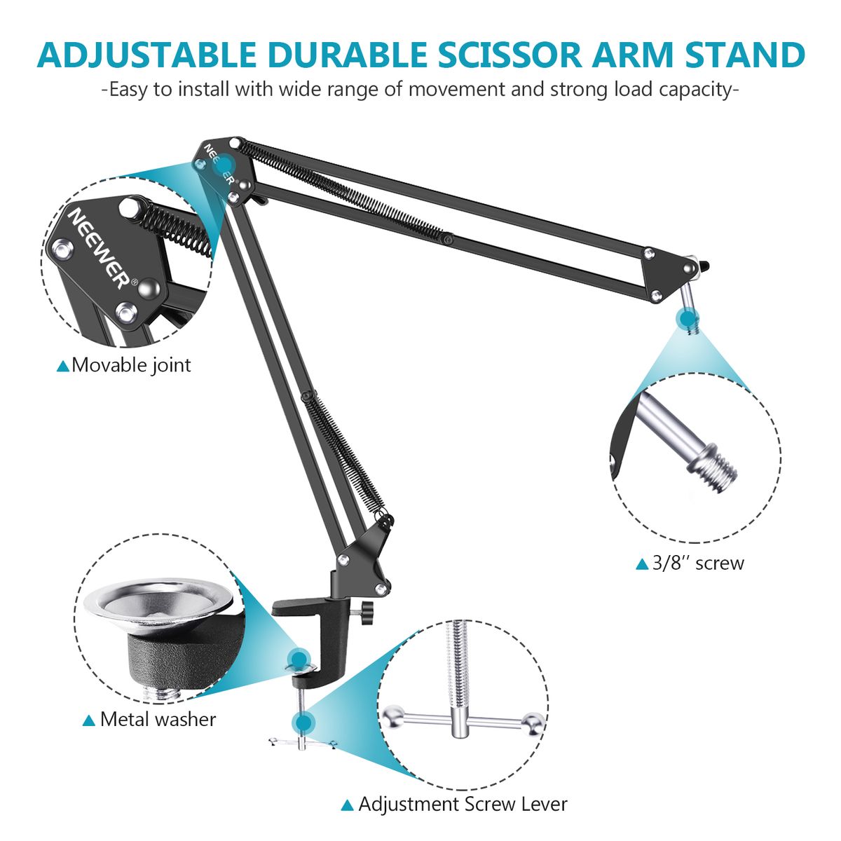 NW-35 adjustable microphone scissor arm stand is made of quality metal frame. Sturdy and durable. Each Arm Length: 14 inches/35 centimeters