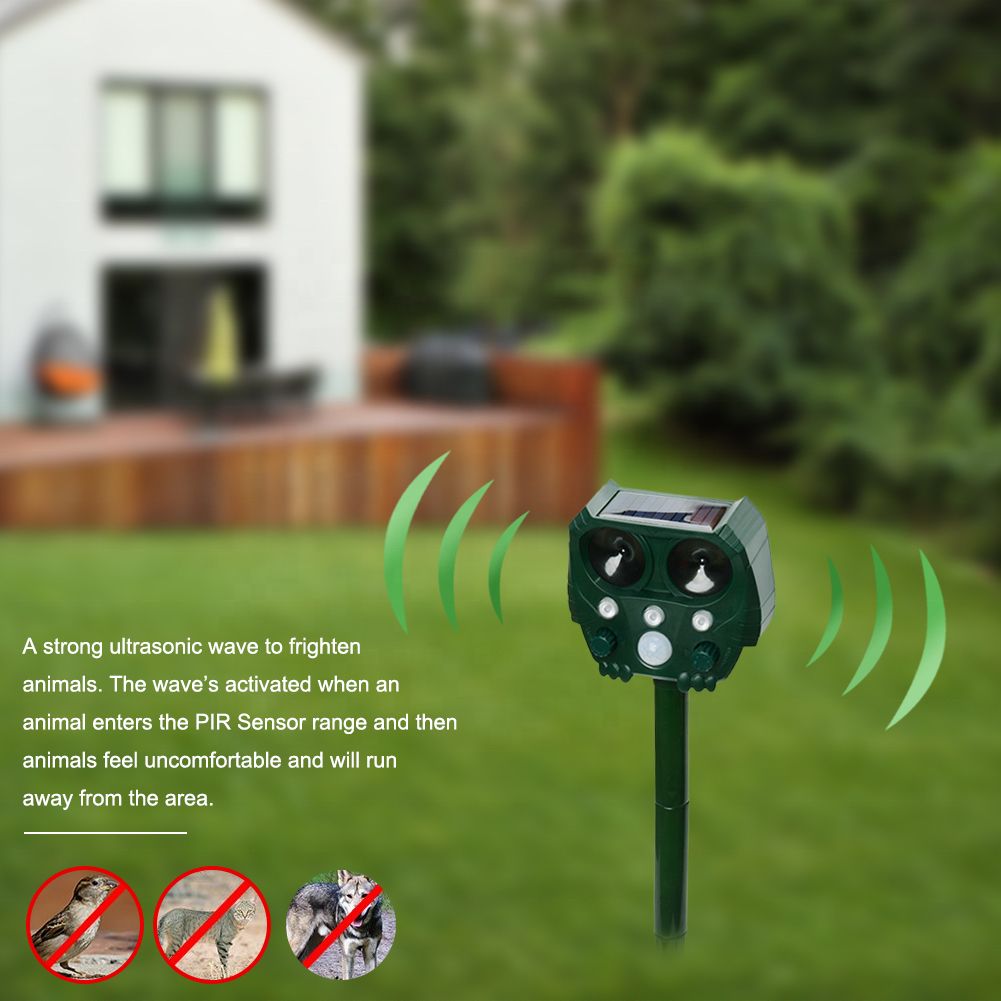 When an animal enters the protections ranges of PIR sensor, the insects repeller will be activated, which will trigger the insects repeller to emit powerful ultra-sonic waves and strong flash to repel the animal.