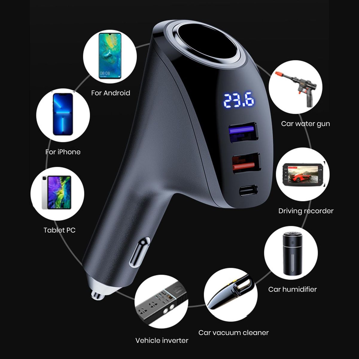Our car charger is equipped with an upgraded high power 80w igniter port, making it compatible with various car electronic devices available in the market. whether it's your mobile phone, tablet, or even a driving recorder, our car charger can simultaneously charge up to four devices at once, making it perfect for families or road trips with friends.