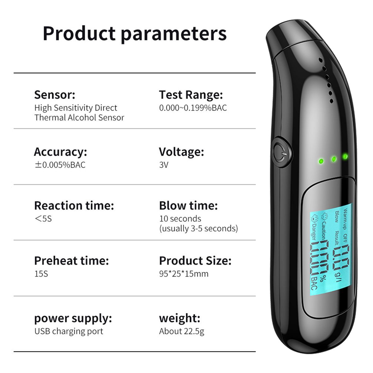 Description This Portable Breathalyzer is used to measure the concentration of alcohol in the human body. With the help of sensitive semiconductor rs, this Digital Breathalyzer provides fast and accurate measurements so you know exactly if you can drive. Specifications Name: Alcohol Tester Model: C06 r type: Semiconductor type r Display: LCD liquid crystal display (black and ) Shell material: ABS Test range: 0.00-0.19%BAC(0-1.9g/l) Measurement unit: mg/l (BrAC) mg/ml (BAC) Measurement mode: quick check, automatic detection Measurement time: 20 seconds Power supply mode: built-in rechargeable polymer lithium battery Using battery: 3.7V 140MAH can be tested 150 times continuously Power adapter requirements: DC5V 1A Working temperature: 0-45℃ Warm-up time: 10 seconds Blowing time: within 10 seconds, more than 4 seconds required Response time: le than 5 seconds Working current: 250MA (max) Standby current: le than 20UA Packing list 1 x Alcohol Breathalyzer 1 x Charging cable 1 x Instruction