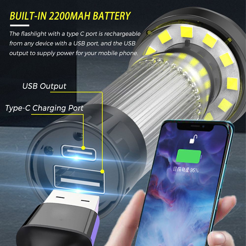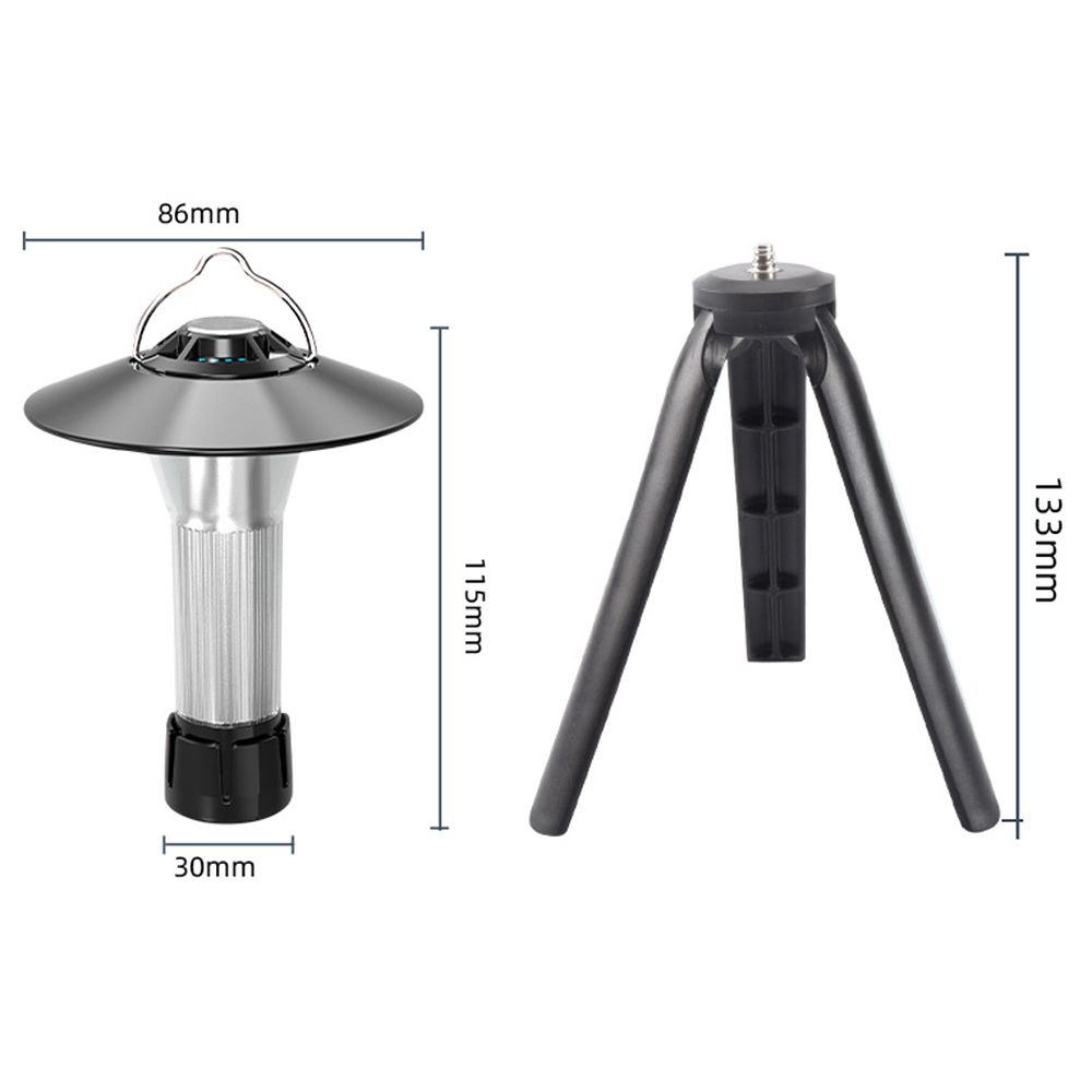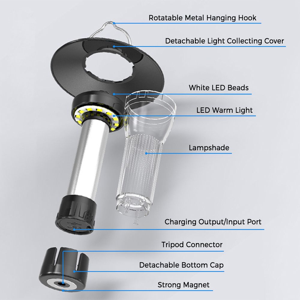 Package: Includes a flashlight, tripod, detachable lamp cover, detachable bottom cap, and a charging cable.