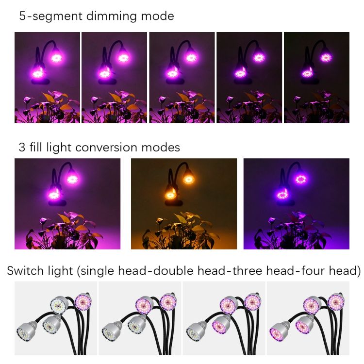 2. Timing + 5-speed light adjustment, 5-stage dimming/3 fill light conversion modes/switching lights/timed lighting (single head-double head-three heads-four heads)