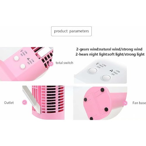 Night Light & Hanging Hook Design 3 Adjustable Speed Setting Mini Fan - Low, medium and high. At the bottom of the desk fan featured with a night light, which's perfect for camping, hiking or other outdoor activities. Back of the fan equipped with hanging hook, can be hanged inside the umbrella while walking.